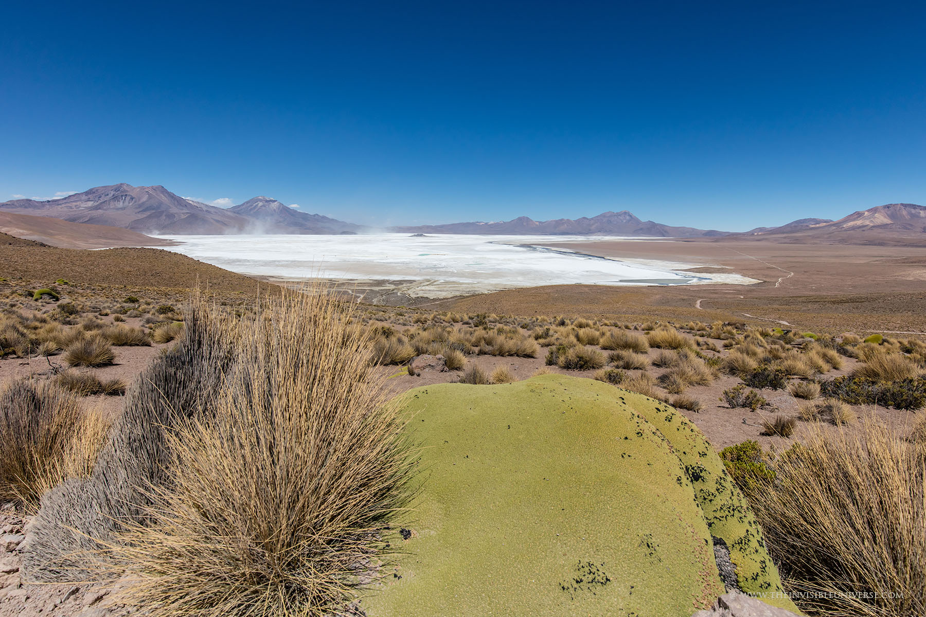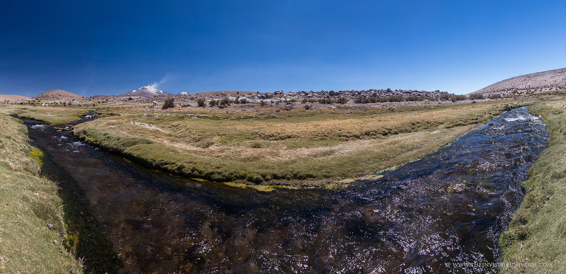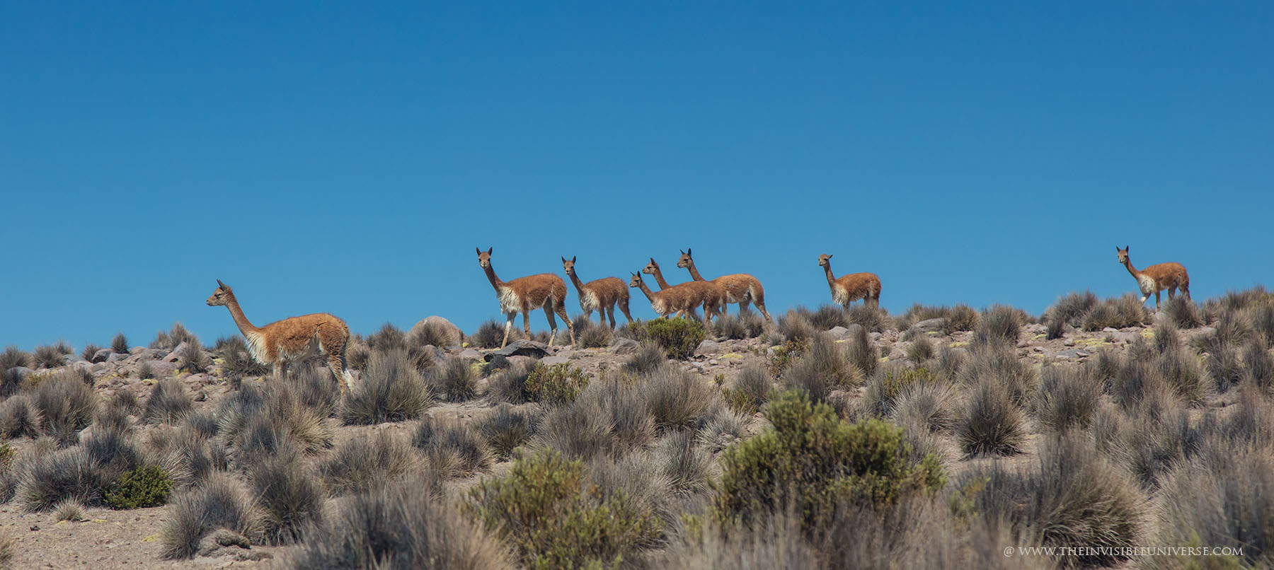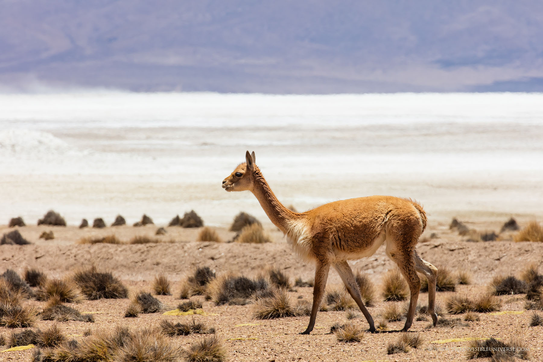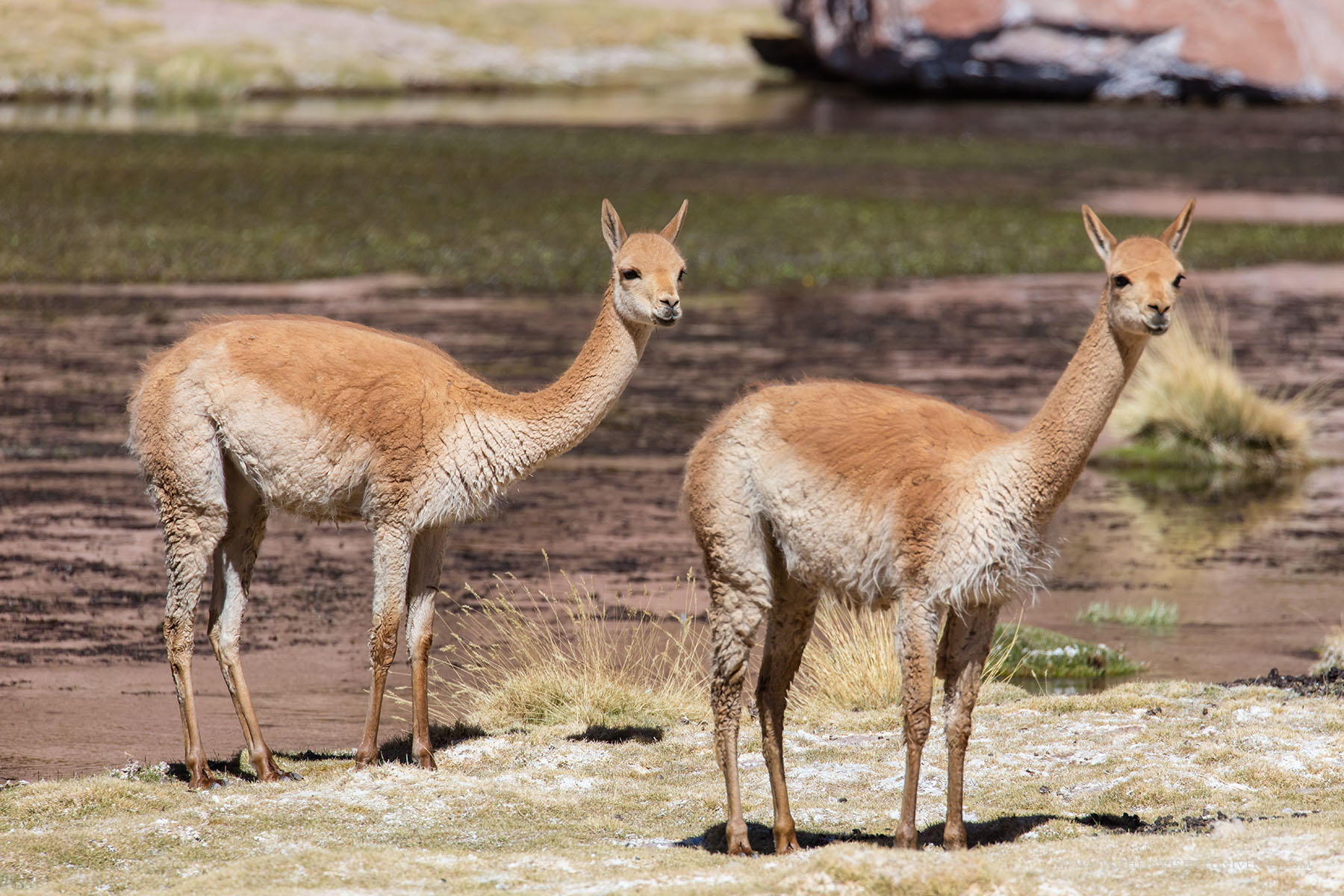 Oben: der Salar de Surire, eine große Salzpfanne im nördlichen Altiplano. Wild lebende Vicunas streifen über die gleißen helle Ebene auf dem Weg zur nächsten Wasserstelle.