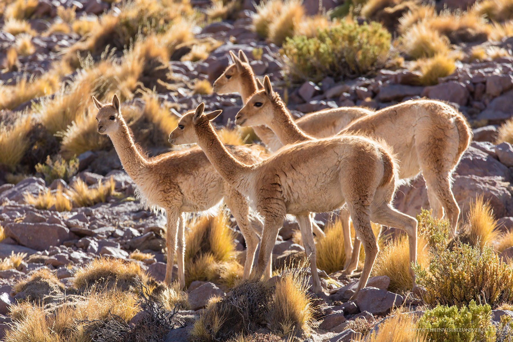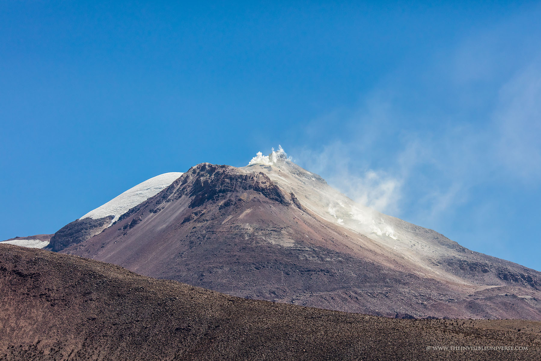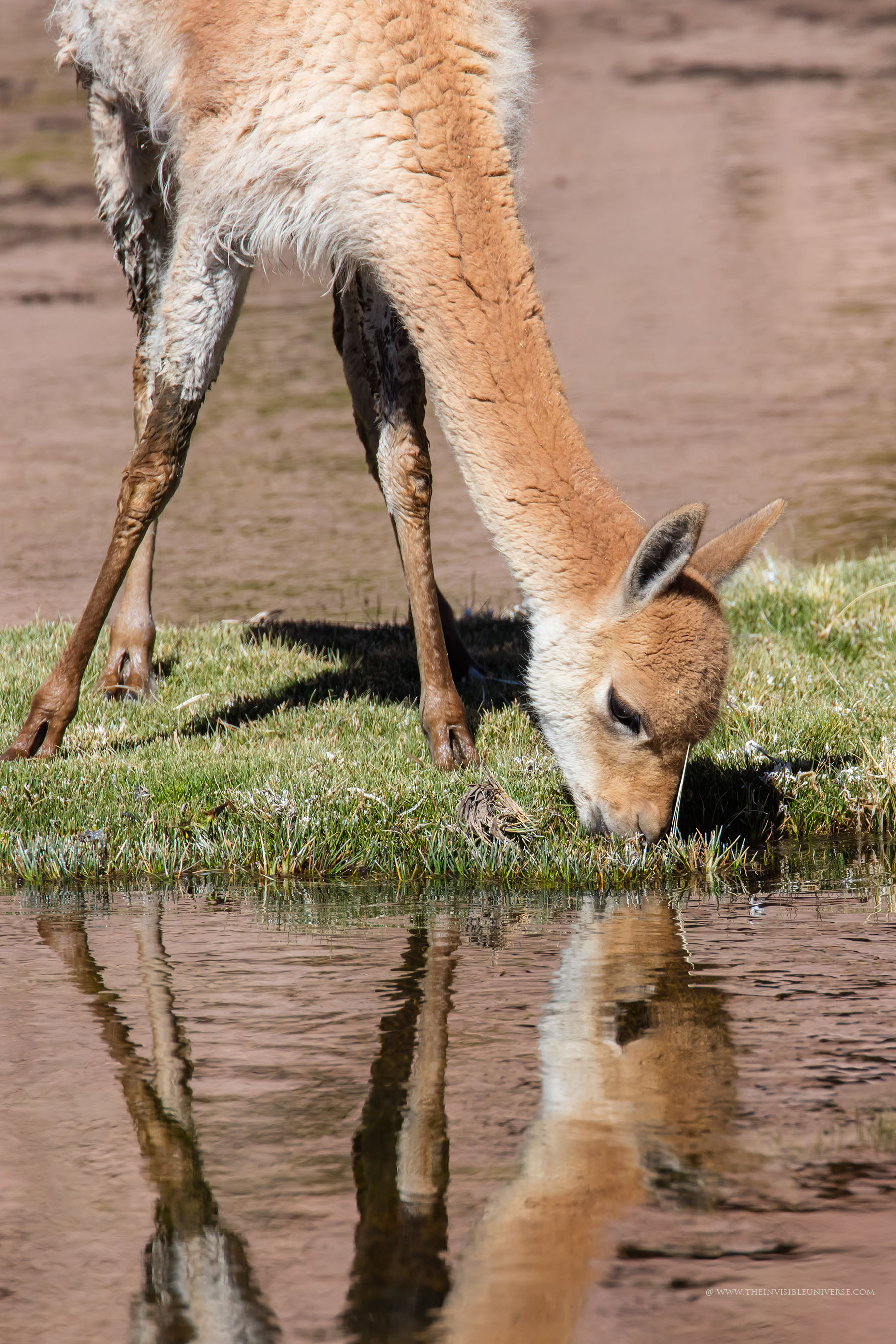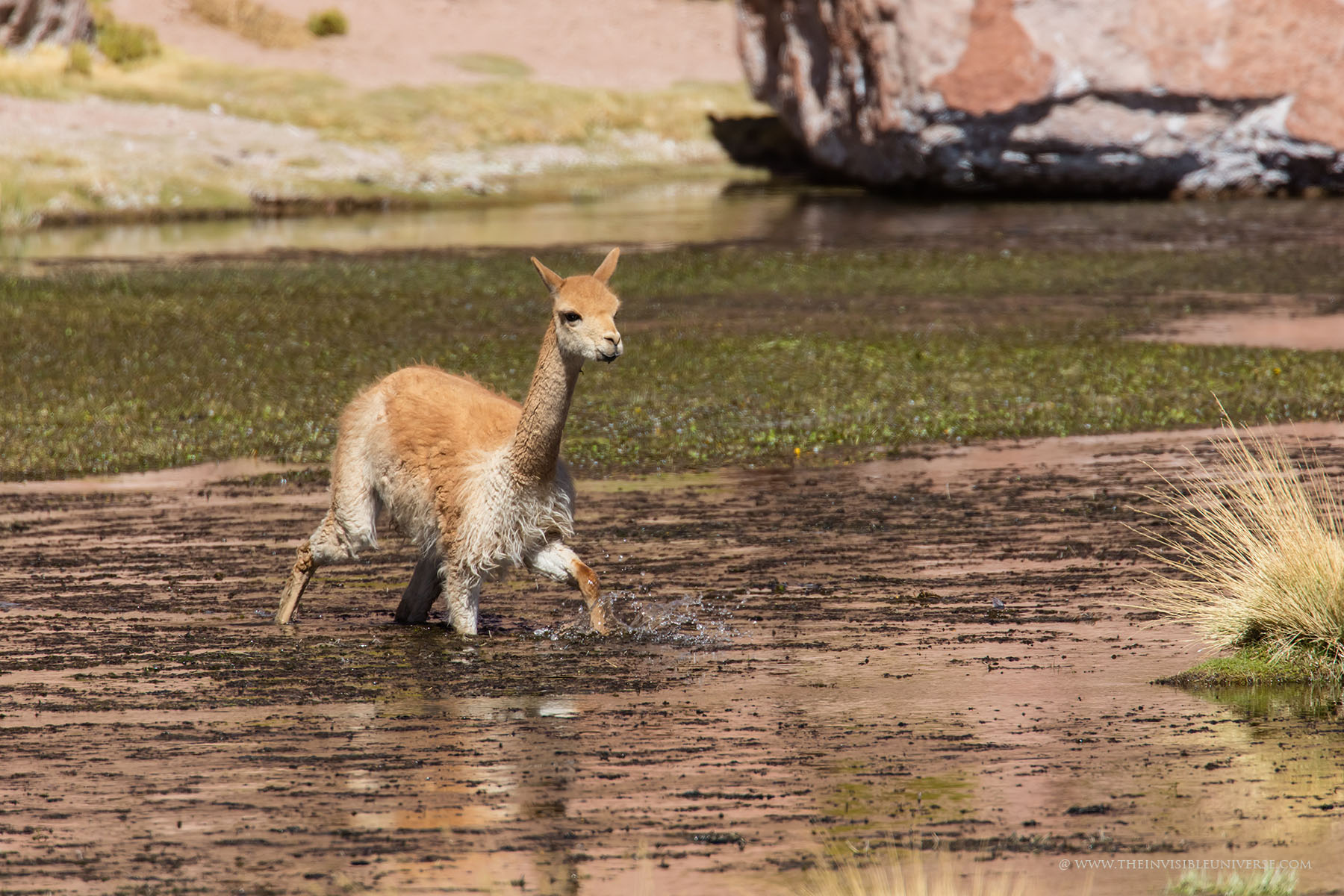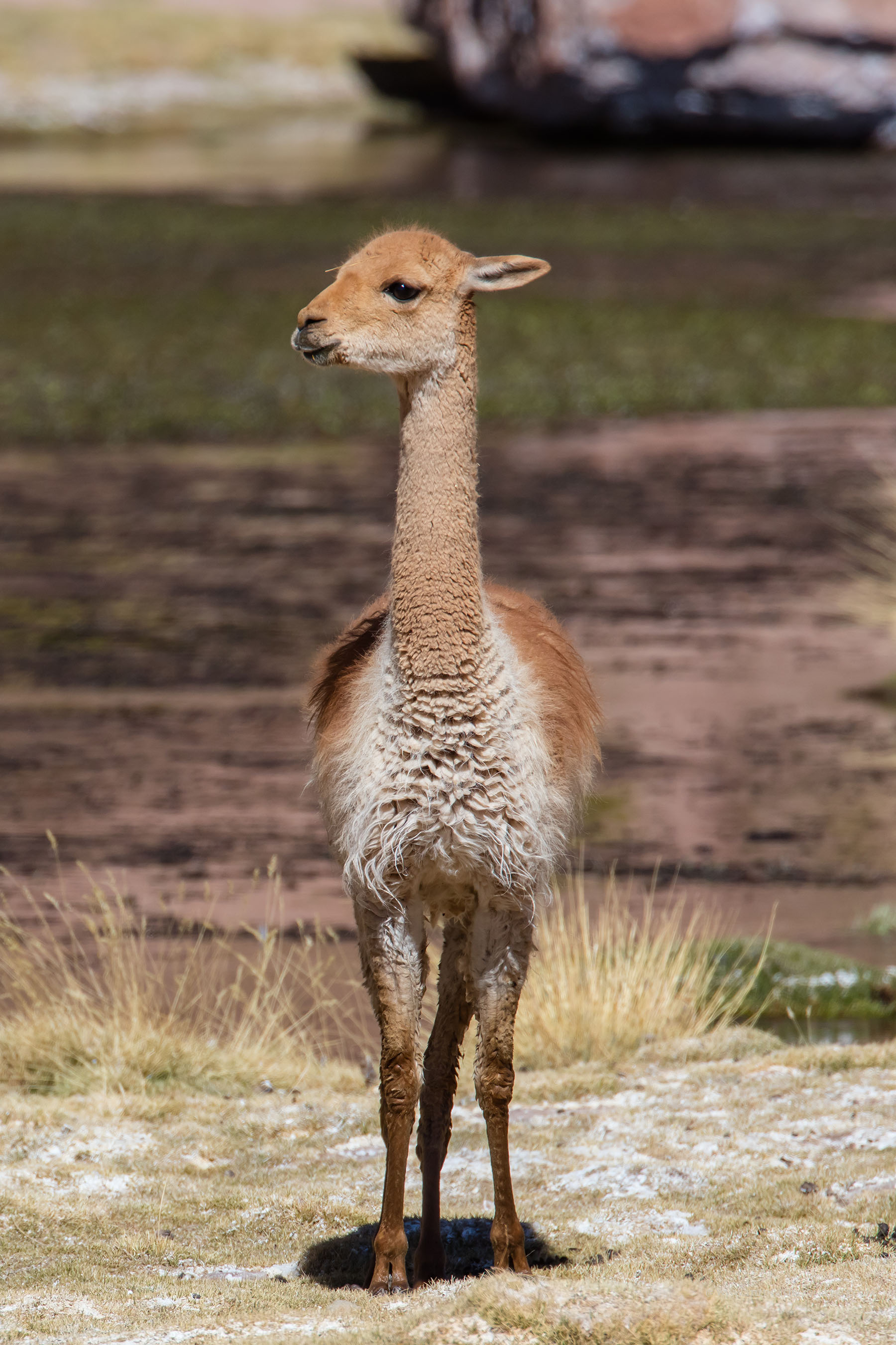Oben: der Salar de Surire, eine große Salzpfanne im nördlichen Altiplano. Wild lebende Vicunas streifen über die gleißen helle Ebene auf dem Weg zur nächsten Wasserstelle.