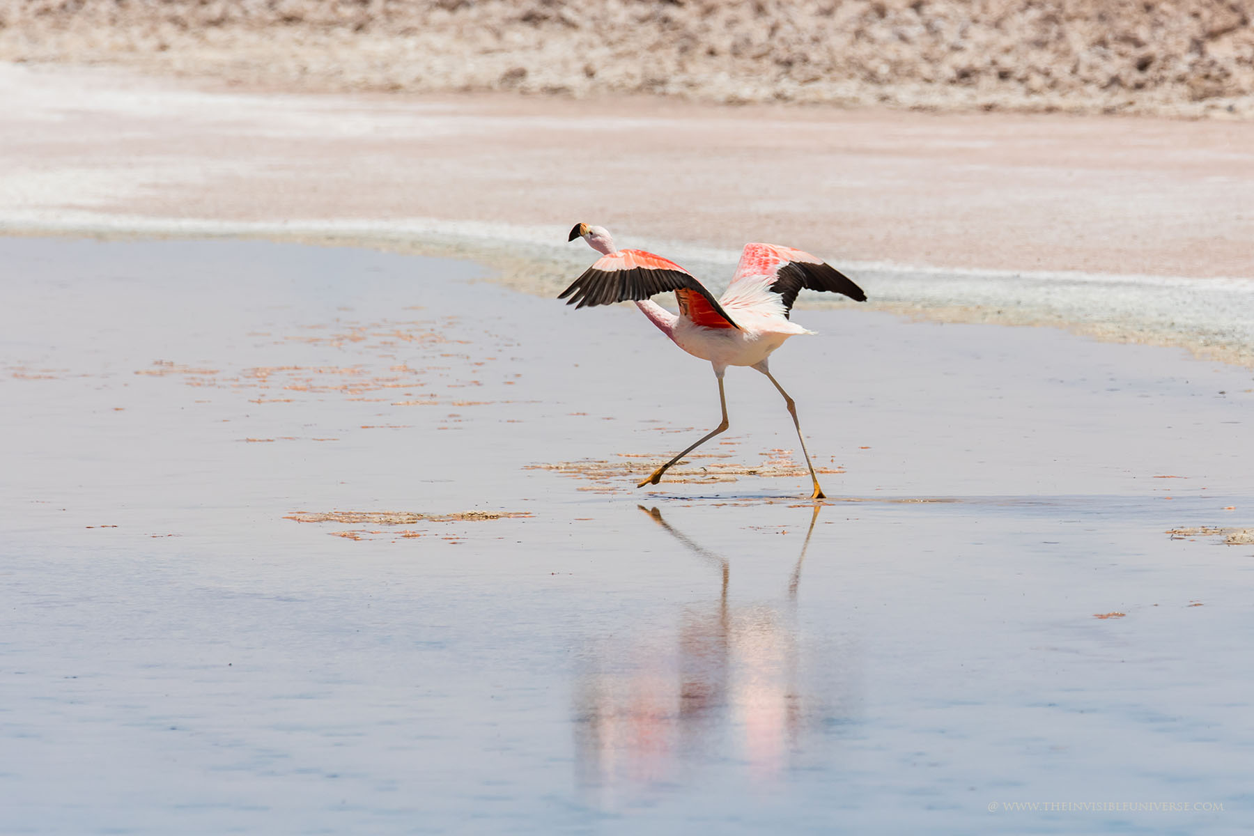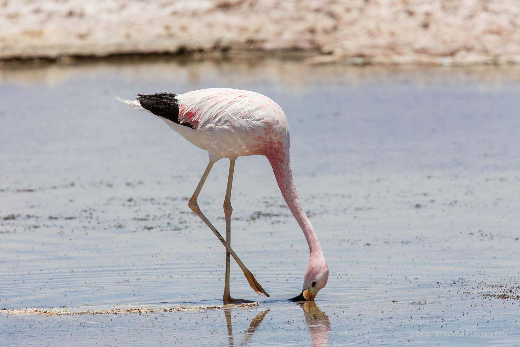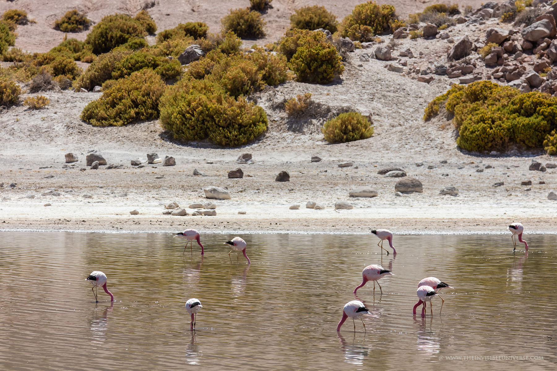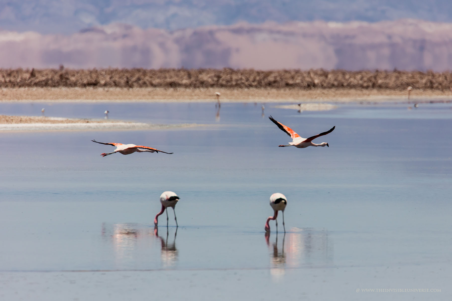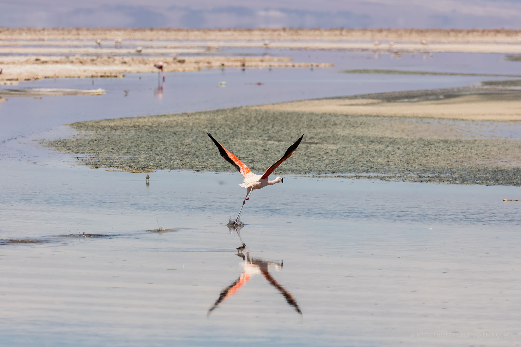 Aus einem unterirdischen See dringt salzhaltiges Wasser an die Oberfläche. Andenflamingos, Anden-Säbelschnäbler und andere Vögel waten hier durch das Wasser. Die Vulkane Miniques und Pular bilden die markantesten Gipfel der Hauptandenkordillere, die sich majestätisch hinter der Laguna Chaxa erhebt. Die berühmten Artemia-Krebse sind hier auch beheimatet und dienen den Flamingos als Nahrungsgrundlage.