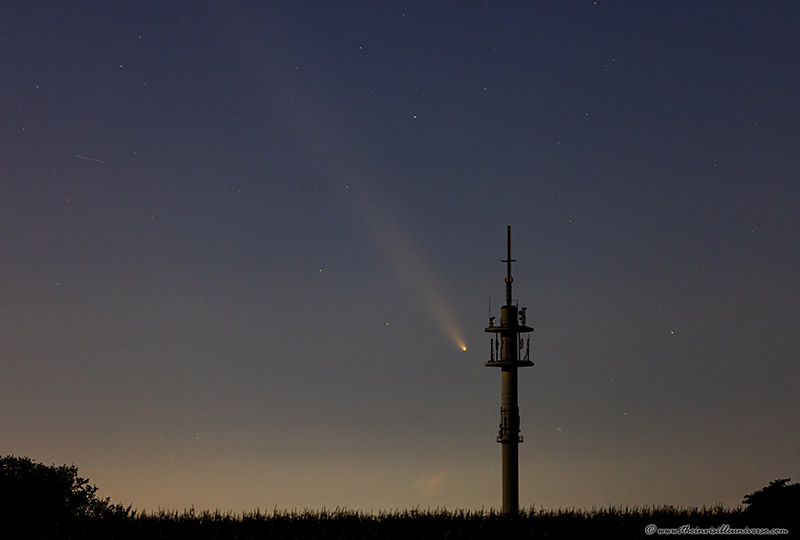 Comet C/2023 A3 Tsuchinshan-ATLAS on October 14, 2024, just a few days after its perihelion. The comet appeared on the evening sky here in Germany. I could catch it right after sunset and was amazed about the long tail and the anti-tail, which was even visible in binoculars. The long exposure shot was done with the Canon R5 and the Canon EF200 f2.8 II lens.