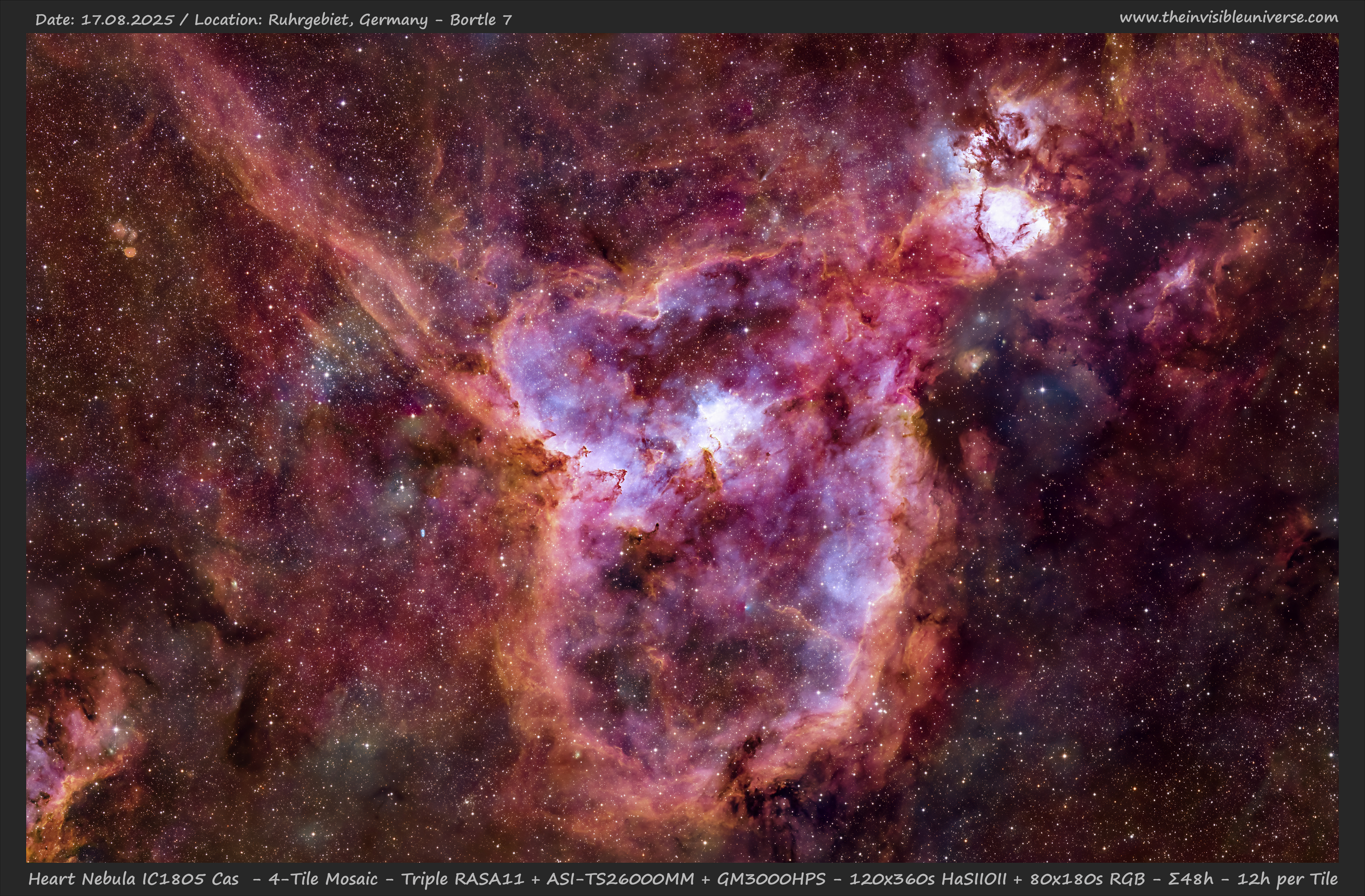4-tile mosaic of the famous Heart Nebula with a total of 80 megapixels. I spent a total of 48 hours capturing the 6 tiles in Ha, OIII and SII as well as RGB with my triple RASA11 astrograph. Of course, it would have been easier to use a shorter focal length optic and the ASI6200MM full-frame camera with 60 MPix to capture the nebula with less effort. But in this case I have the resolution of an optic with 620 mm focal length and 11 inch aperture. However, this can only be realised if the photo is viewed in full resolution. The image processing of such a large amount of data, 4 tiles with 6 channels each, was a pain. I used Pixinsight with the integrated mosaic procedures to align the individual tiles and stitch them together.