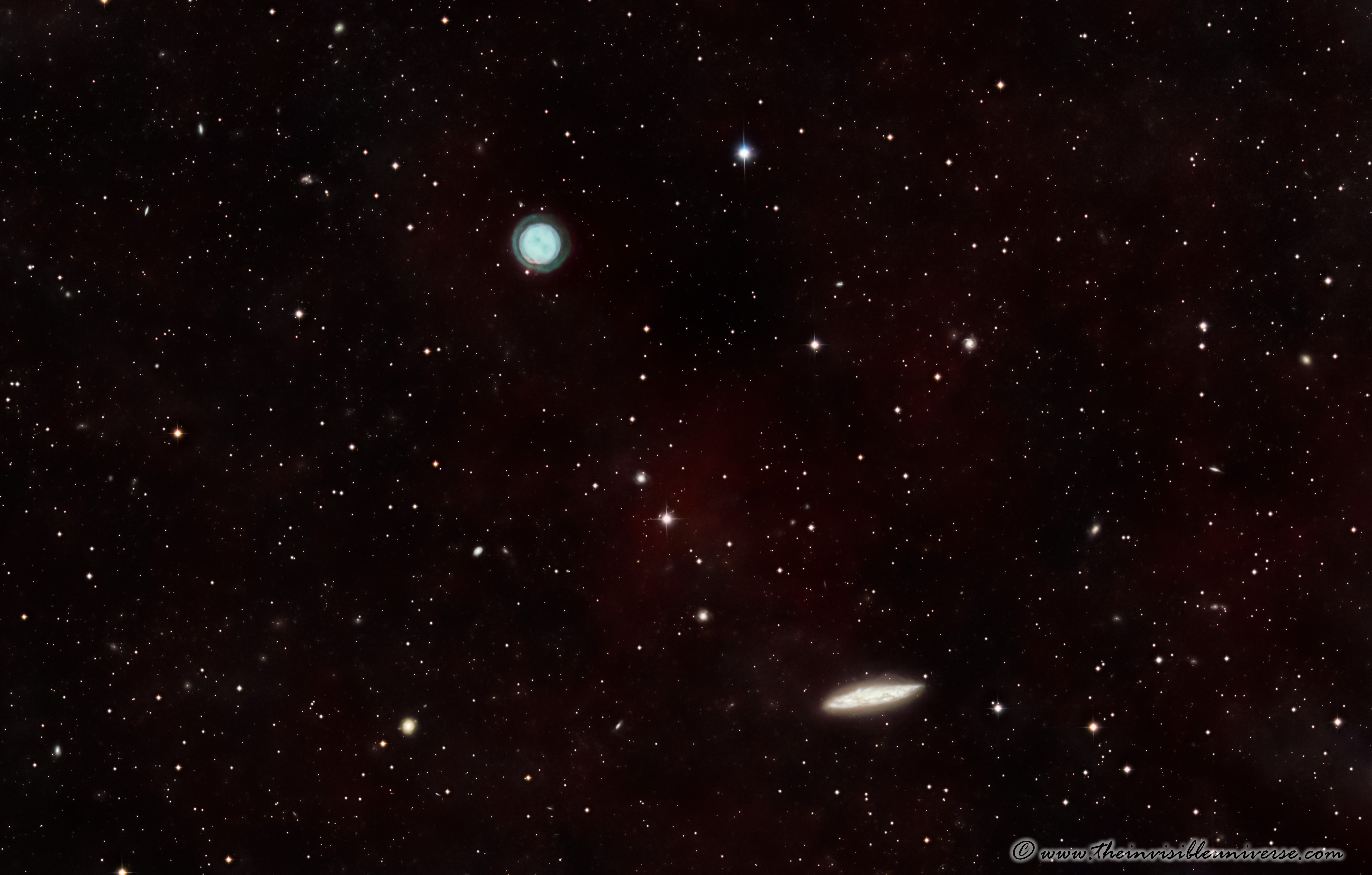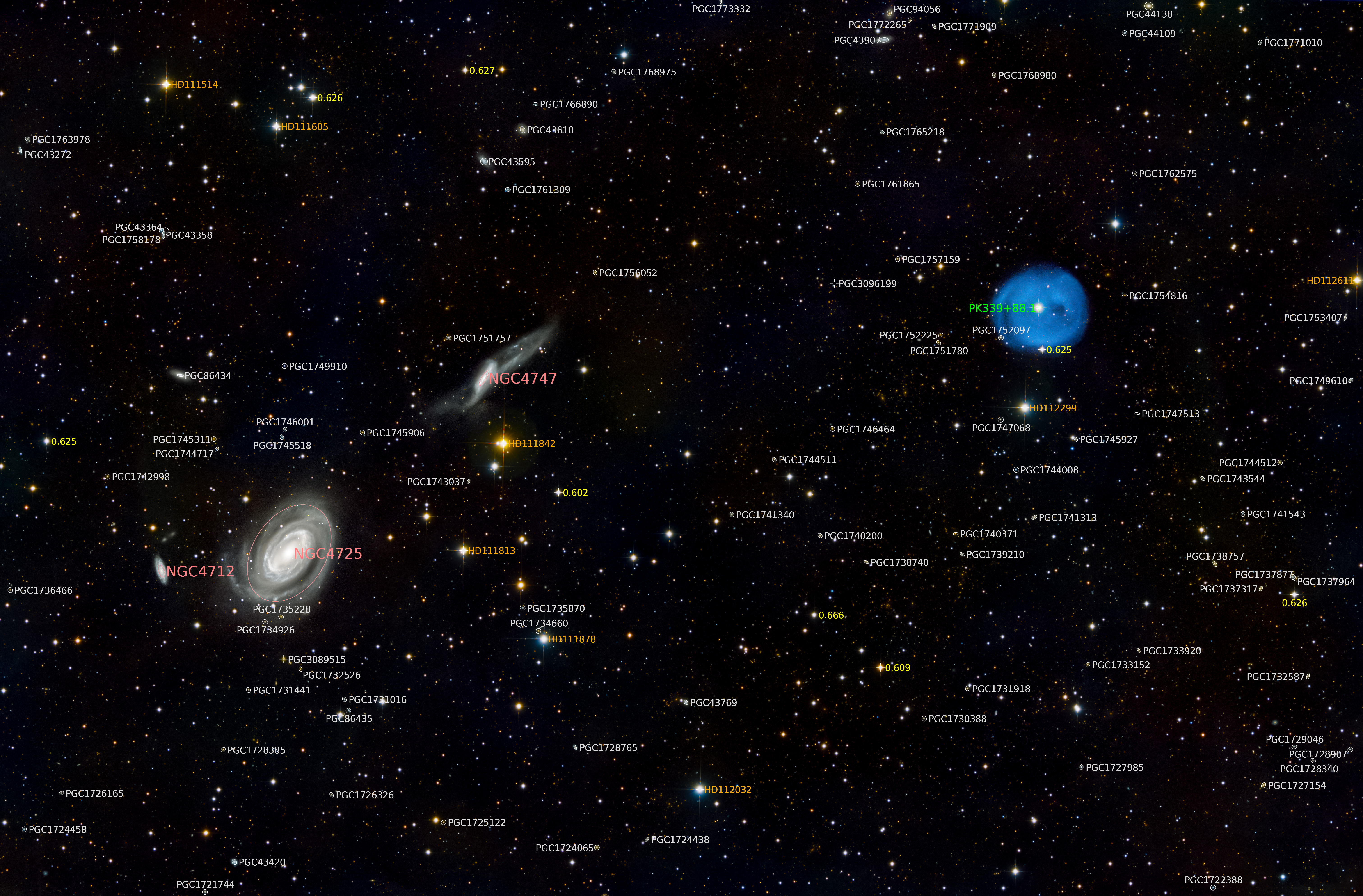 The planetary nebula LoTR 5 and NGC 4725 in Coma Berenices. This is also a re-visit of an object previously photographed with the ASA10N Newtonian astrograph. This time I used the Triple RASA11 to accumulate 36 hours of integration time at f2.2 in Ha, OIII and RGB to capture both the blue-green planetary nebula and the galaxies NGC4712, 4725 and 4747.