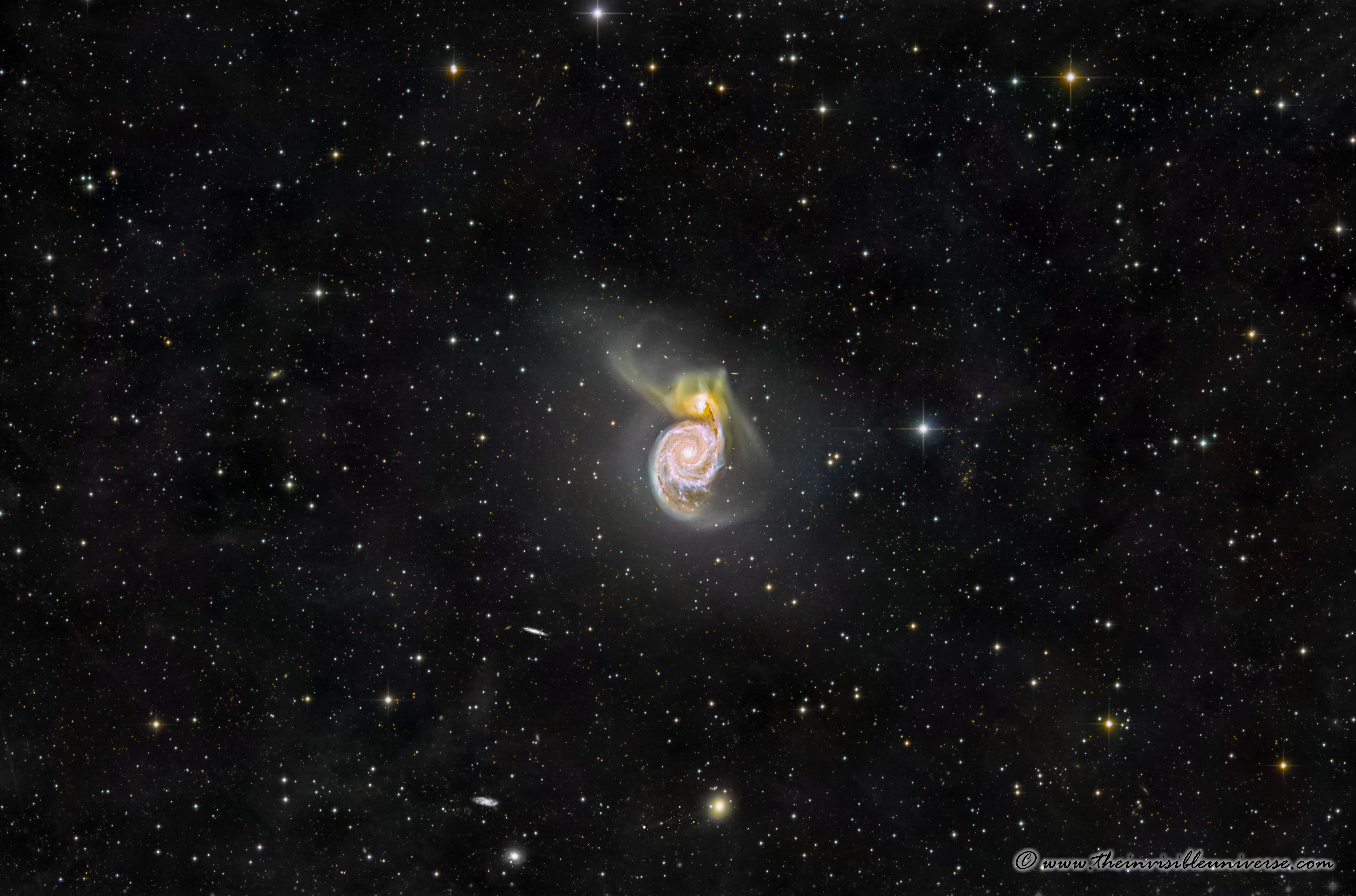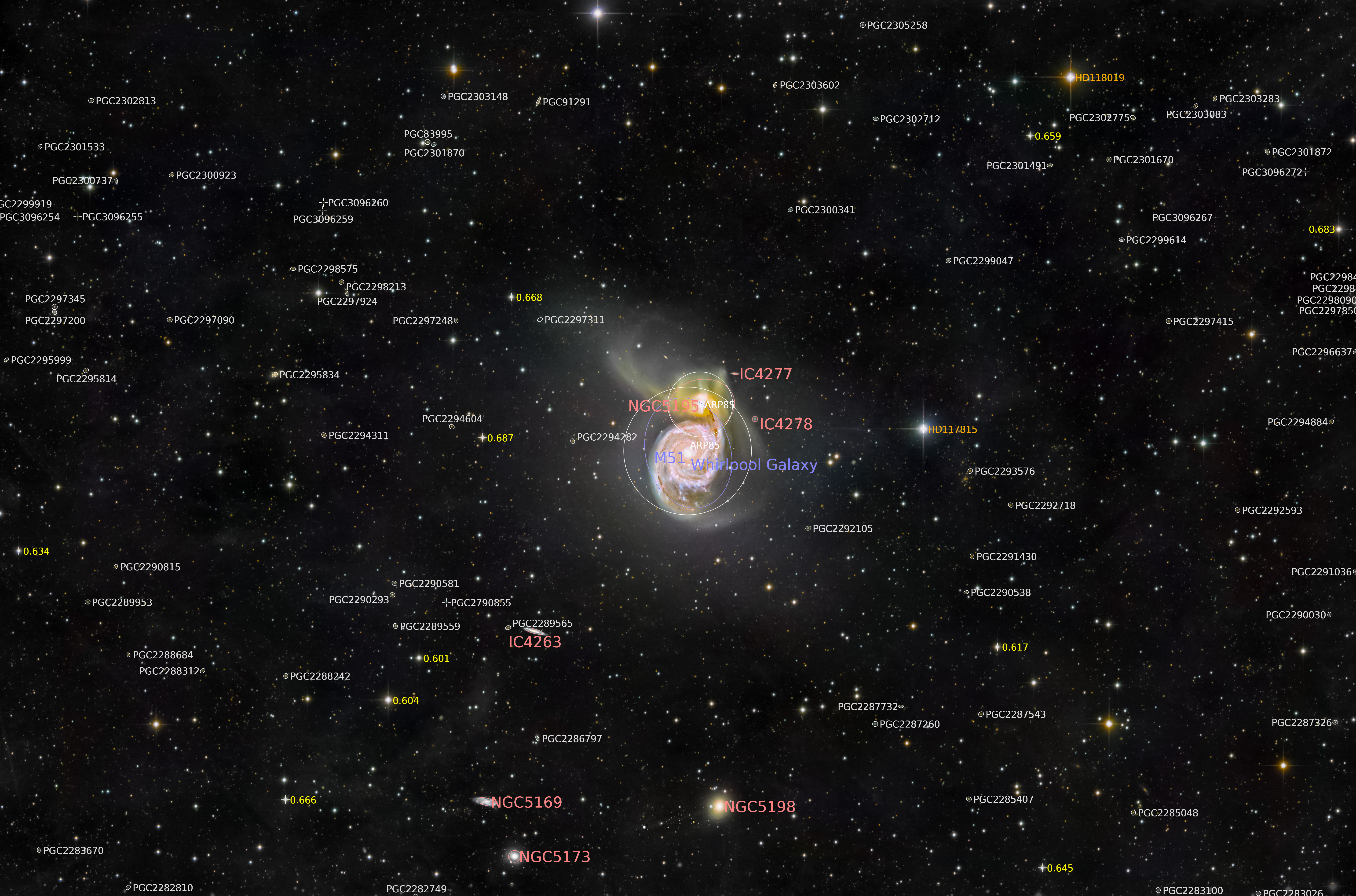 Messier 51 in Canes Venatici with NGC5195 and lots of other galaxies. This is of course not the first image I have taken of this beautiful Galaxy. Long exposure images of M51 taken under dark skies show a lot of interstellar gas and dust. So I wanted to try to capture the intergalactic flux nebula around M51 from a Bortle 7 zone. I needed 32 hours of integration time in RGB and Ha. There are many small and faint background galaxies visible, only a fraction of which have a PGC name! I had to discard many of the images in the red channel due to technicals issues. Finally, I aquired a brand new ASI2600MDUO with an integrated guiding chip.