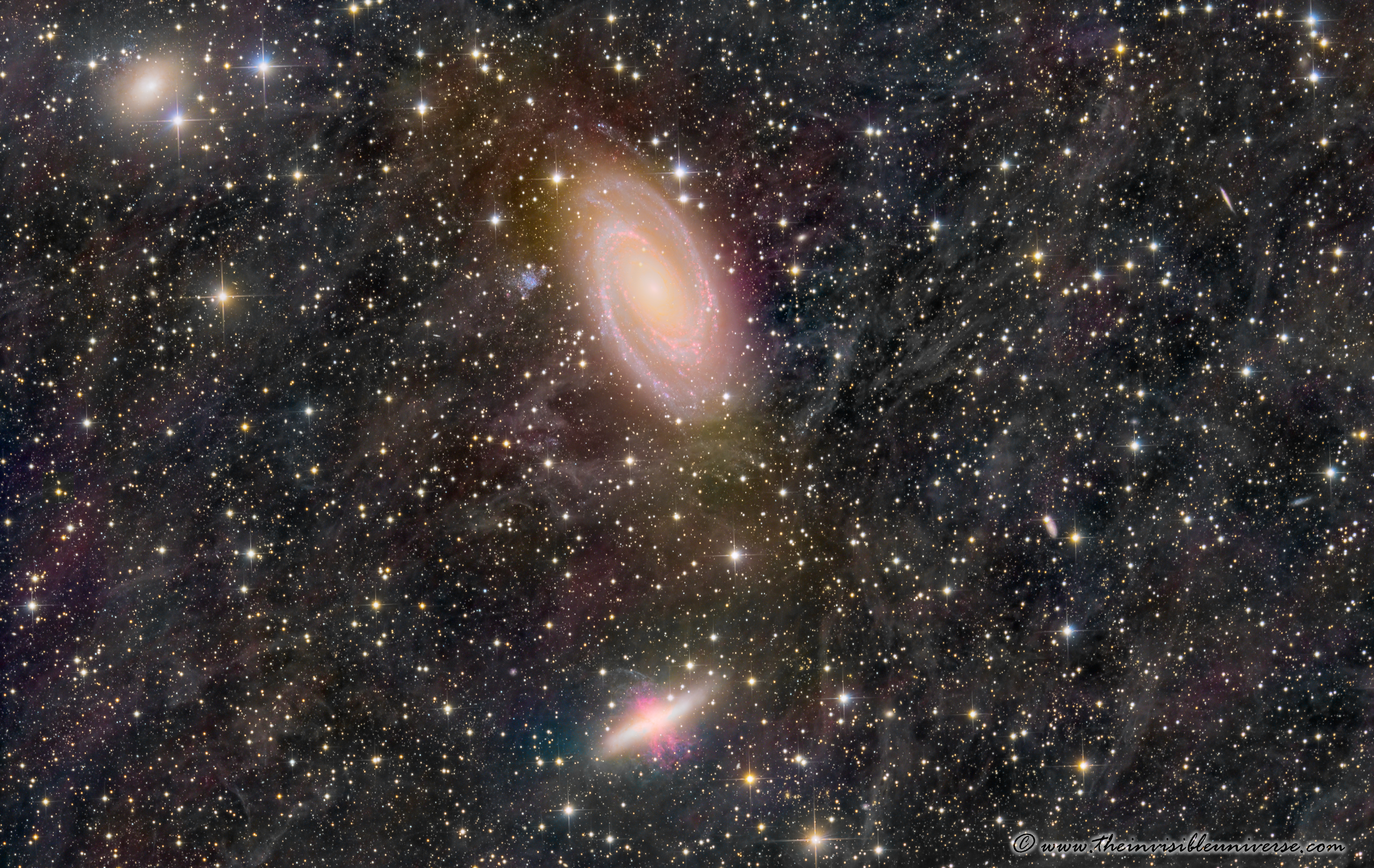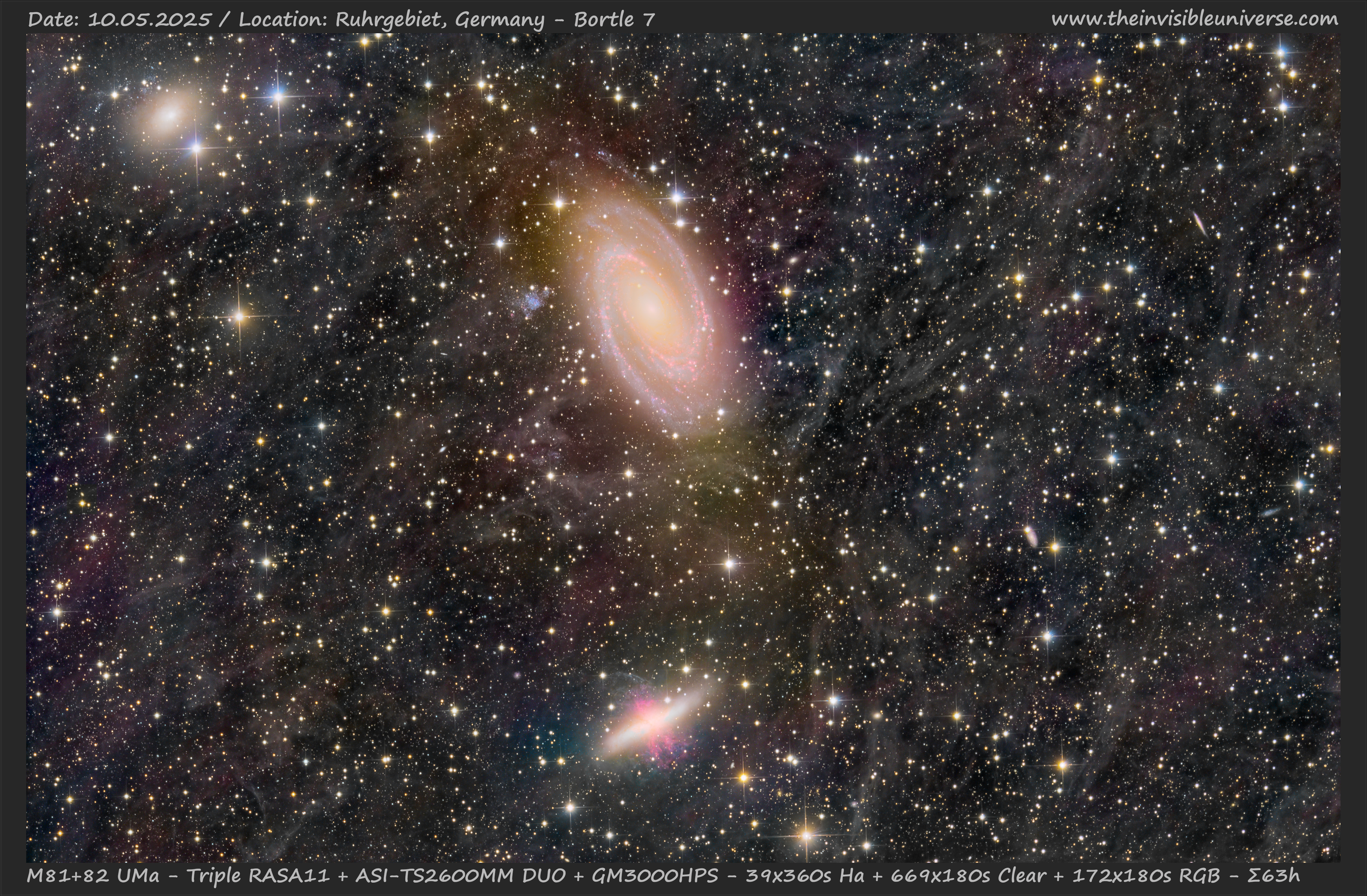 This is a revisit of Bode's Galaxy M81 and M82, the Cigar Galaxy, in the constellation Ursus Major. I had already imaged this target in 2023 with a predecessor version of my current triple RASA11 equipment, but only for 10 hours. The intention was to capture more of the integrated flux nebula around these two galaxies and the faint Ha glow. I put in a total of 63 hours of integration time, over 33 hours of which was with a clear filter alone. Also visible is the satellite galaxy PGC28757, also known as UGC 5336 or Holmberg IX, an irregular dwarf galaxy near M81, as well as NGC3077. As the background with the IFN is emphasised in the image processing, it is difficult to remove satellite and aircraft trails.