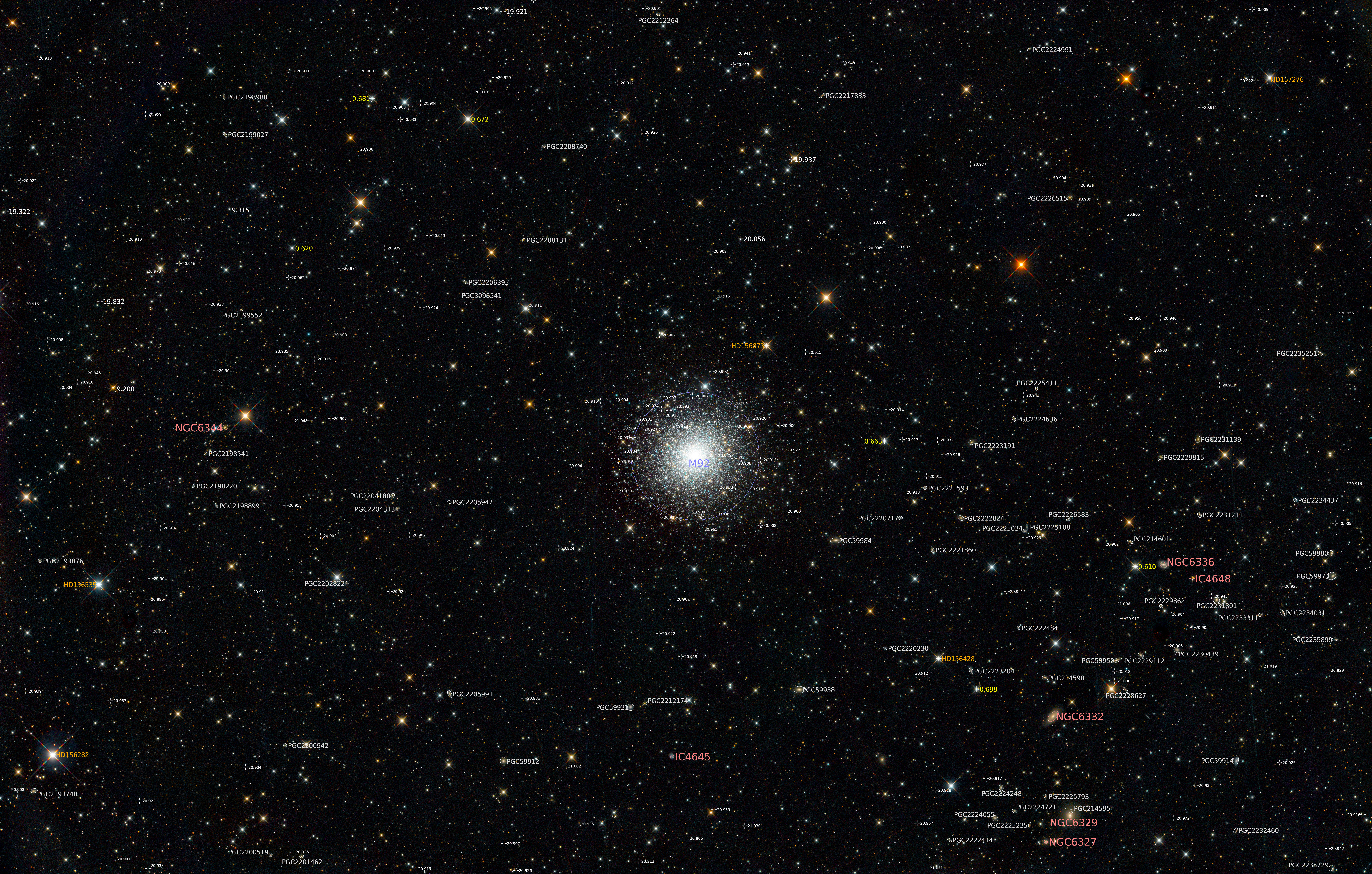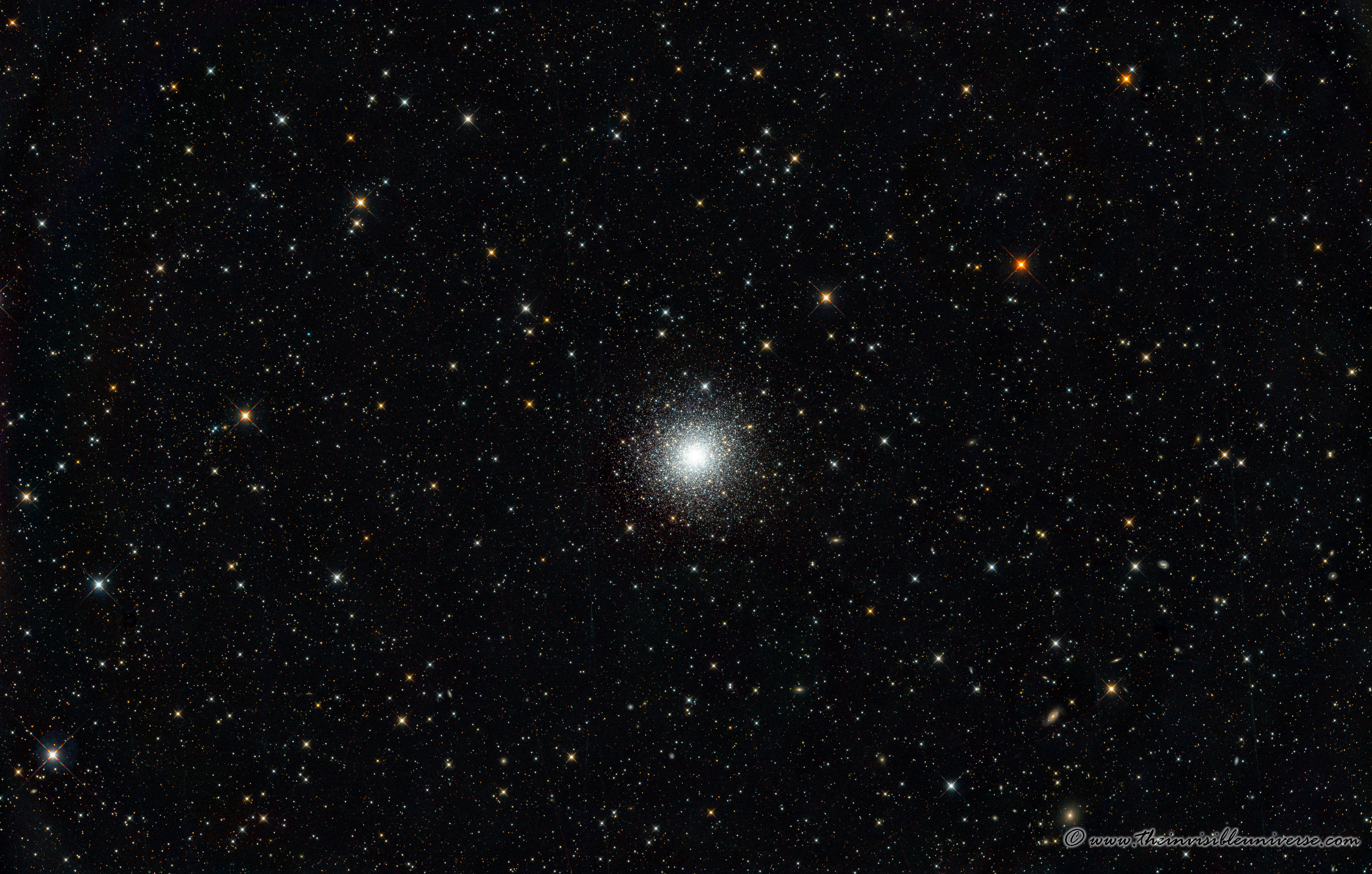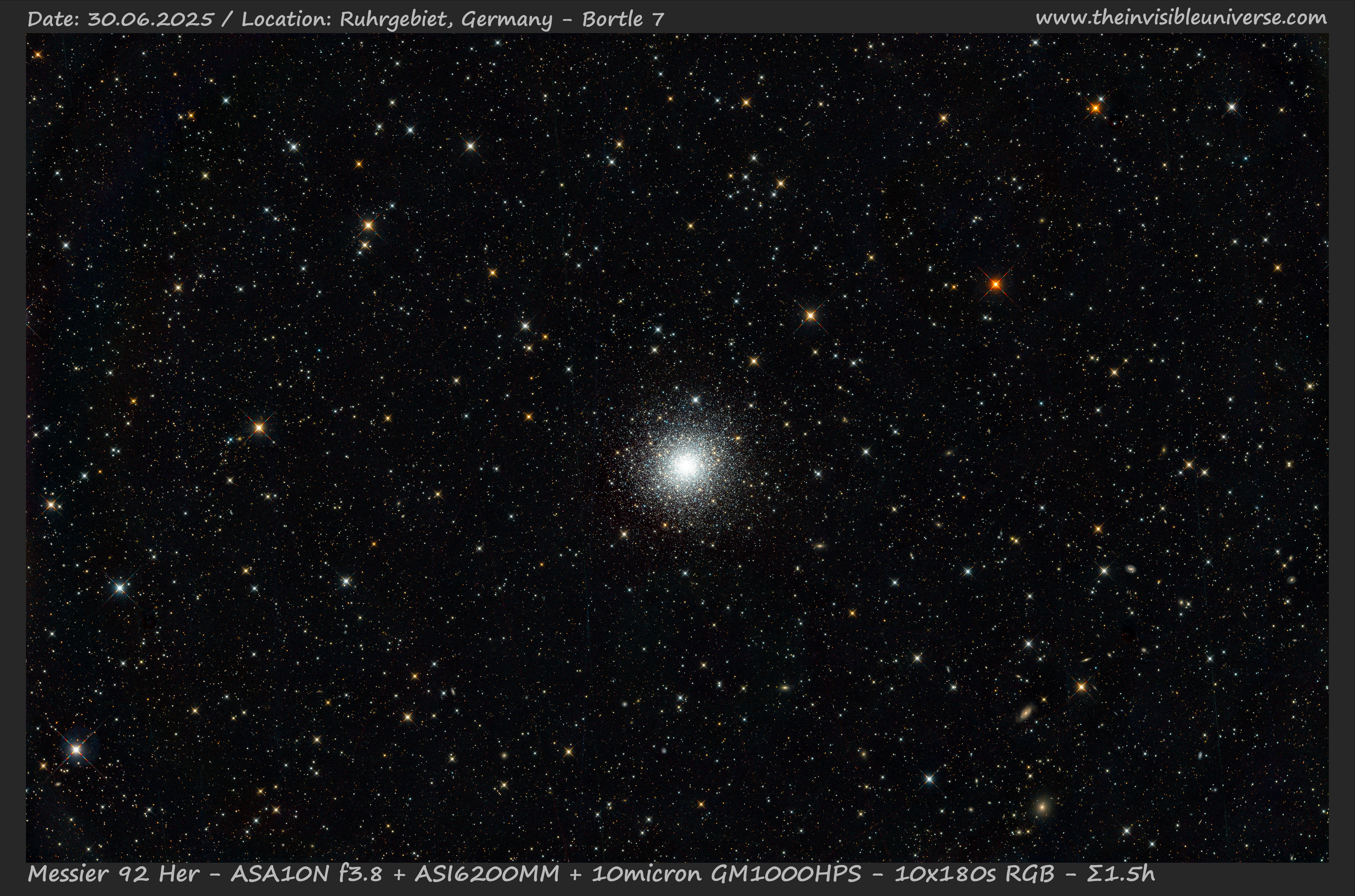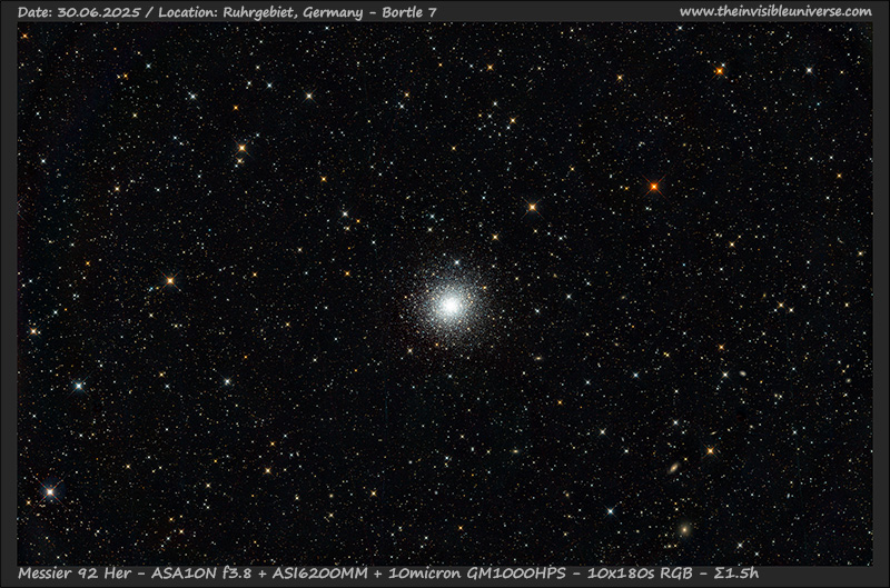 Messier 92 in Hercules, the often overseen globular cluster close to the famous Messier 13. Imaged with my mobile setup, the ASA10N f3.8 Newtonian astrograph and the 10micron GM1000HPS.