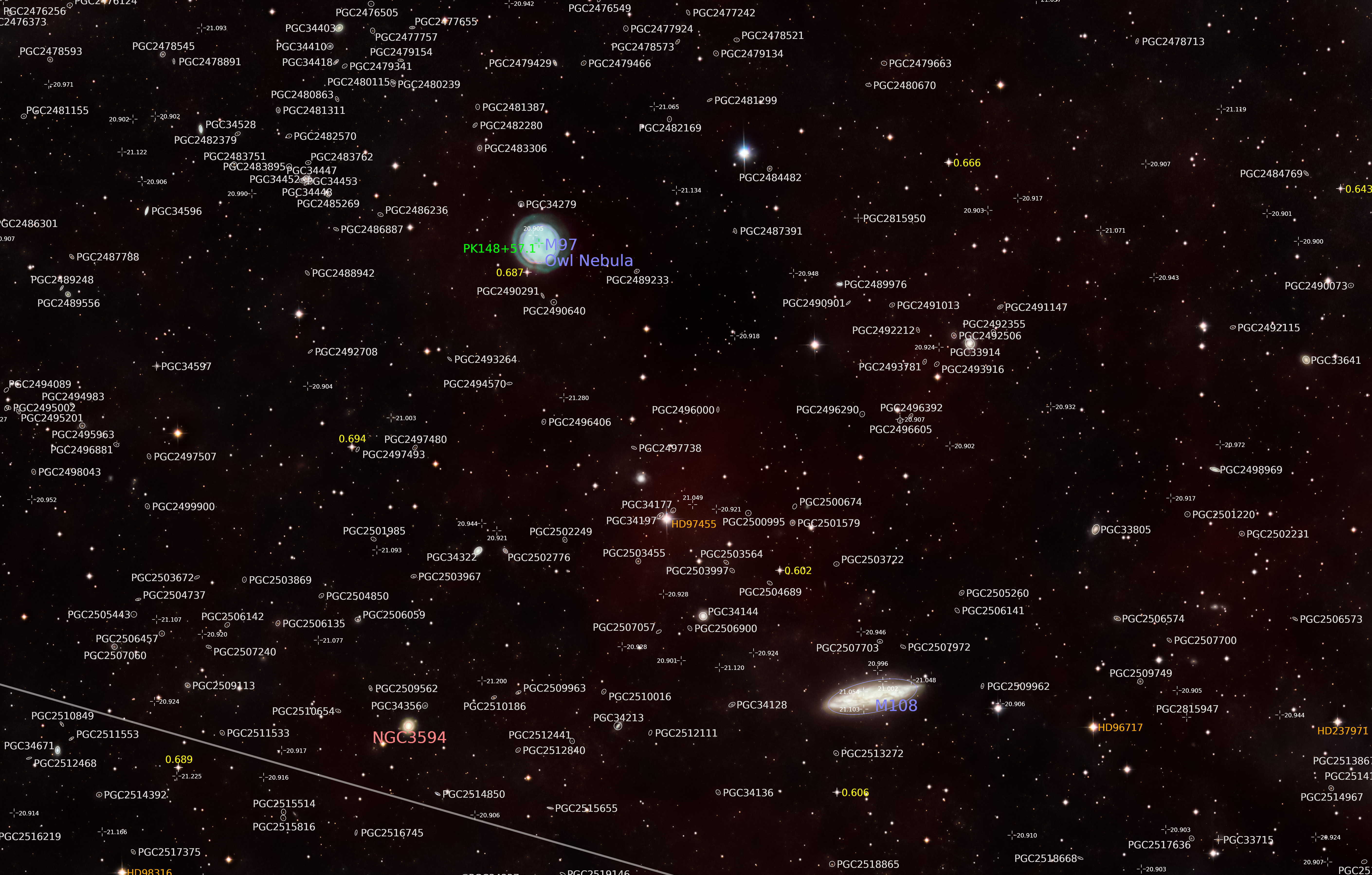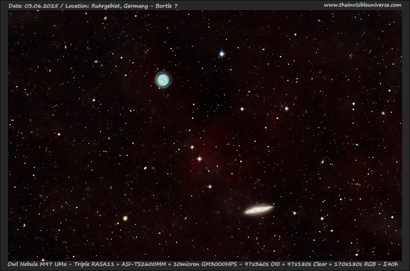 Messier 97, the Owl Nebula, as well as Messier 108 and NGC3594 in the constellation Ursus Major. In the broadband data, I noticed a faint red glow in this part of the sky, possibly a Ha emission. I tried to emphasise the faint outer shell of M97 without overexposing the bright inner part of the planetary nebula.