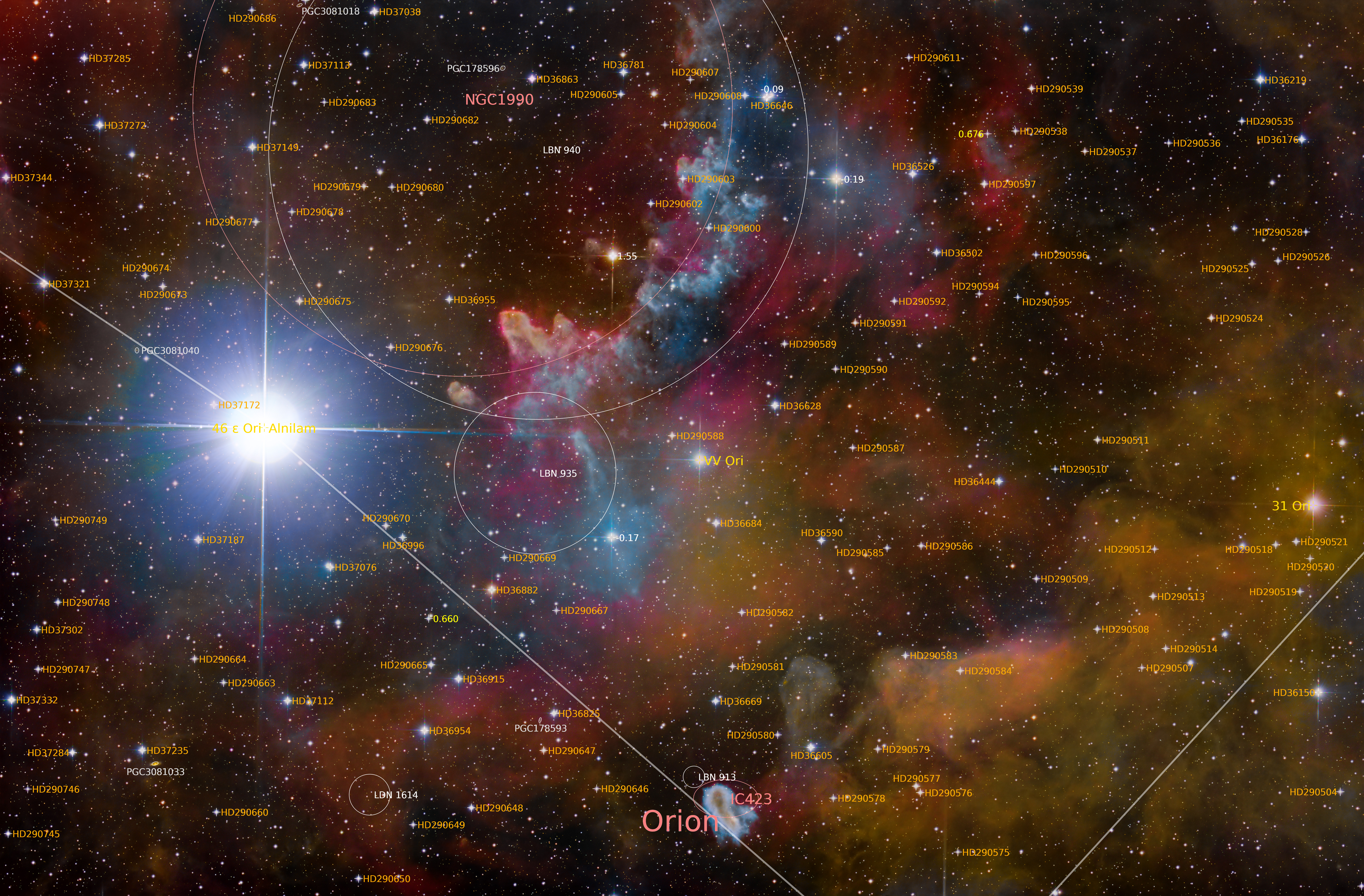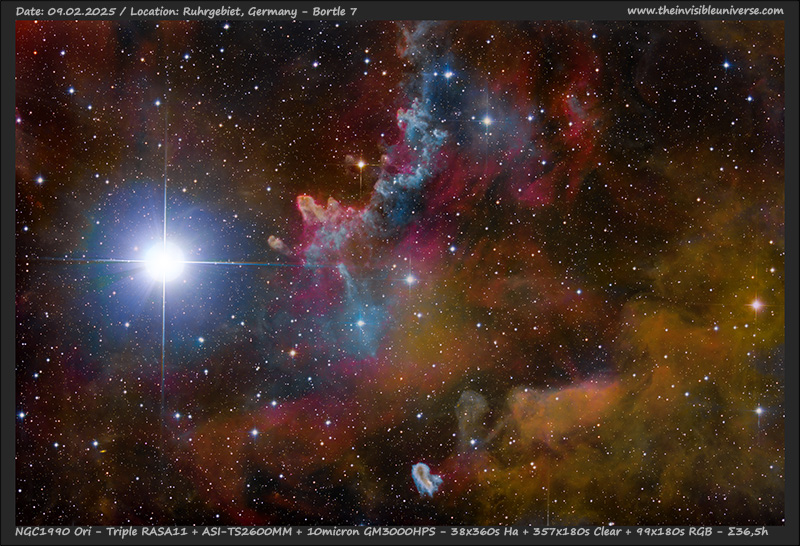 NGC1990 in Orion. The bright star is Epsilon Orionis or Alnilam, the centre of the three belt stars of Orion. At the lower edge of the image (in the west) is the reflection nebula IC423 and further down would be Delta Orionis, the western belt star, which is just outside the field of view. The blue reflection nebula is difficult to recognise against the bright background of the sky. Orion's belt is located far to the south of my observation point. In addition, the south wall of my observatory blocks the lower of the three RASAs. Therefore, I can only take pictures of this region on a few days in winter.