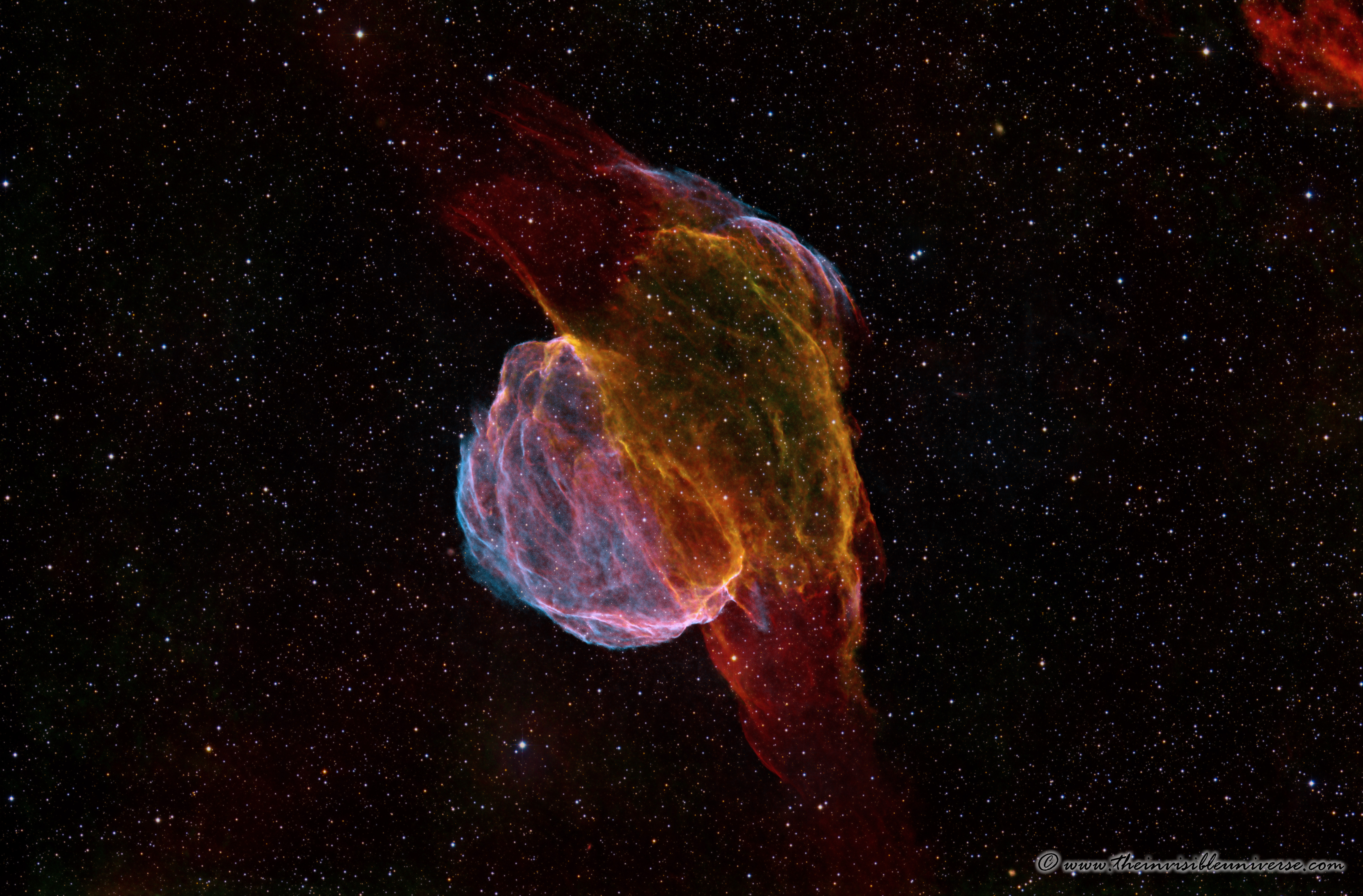 The region around the Lobster Claw Nebula, the Bubble Nebula, the Cave Nebula and the Northern Lagoon Nebula in the constellation of Cepheus is scattered with countless other interesting deep sky objects. Image taken with the TS 76EDPH f4.5 in two different Narrowband-RGB versions with a total of 12h integration time in NB and RGB.