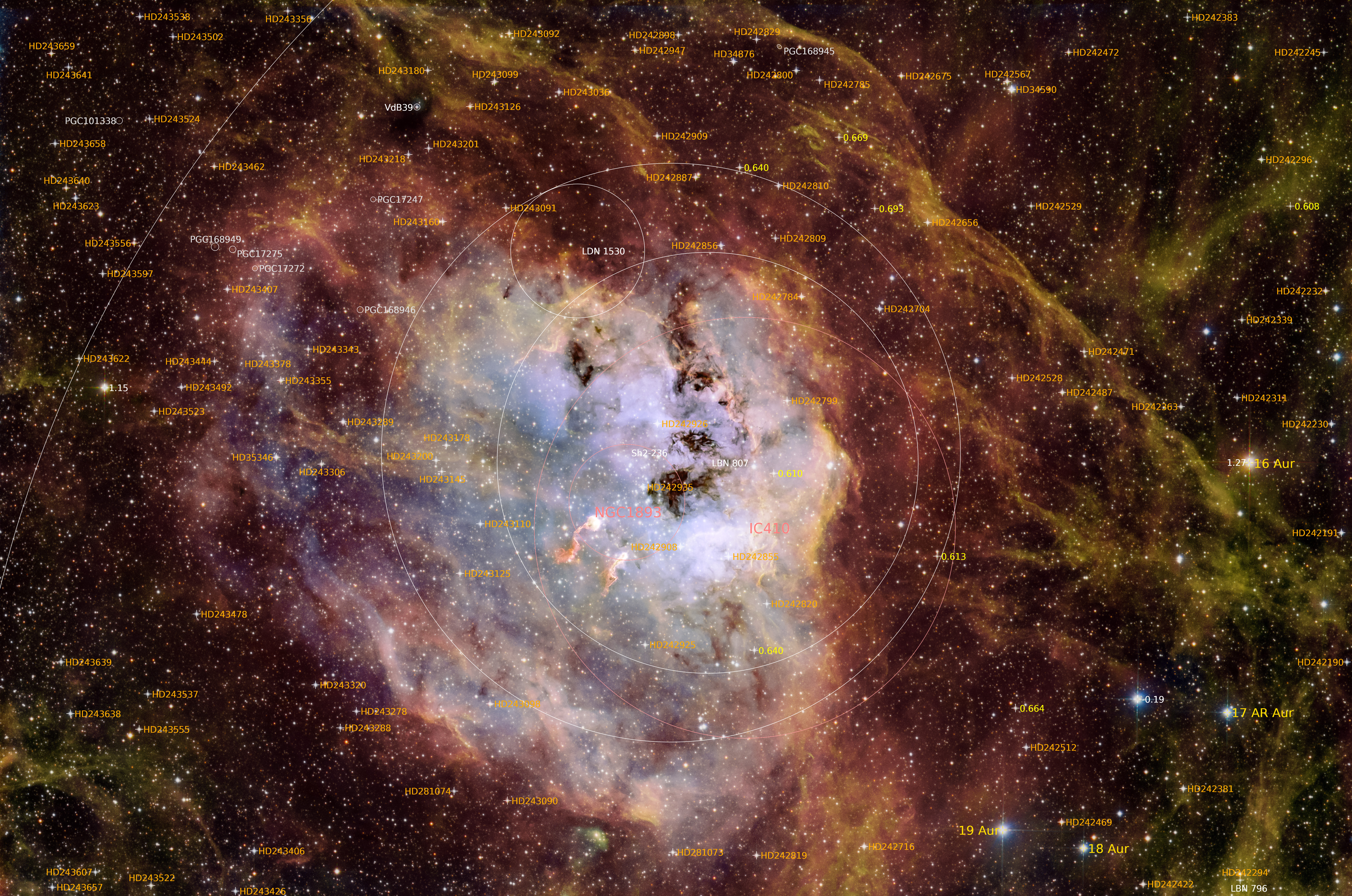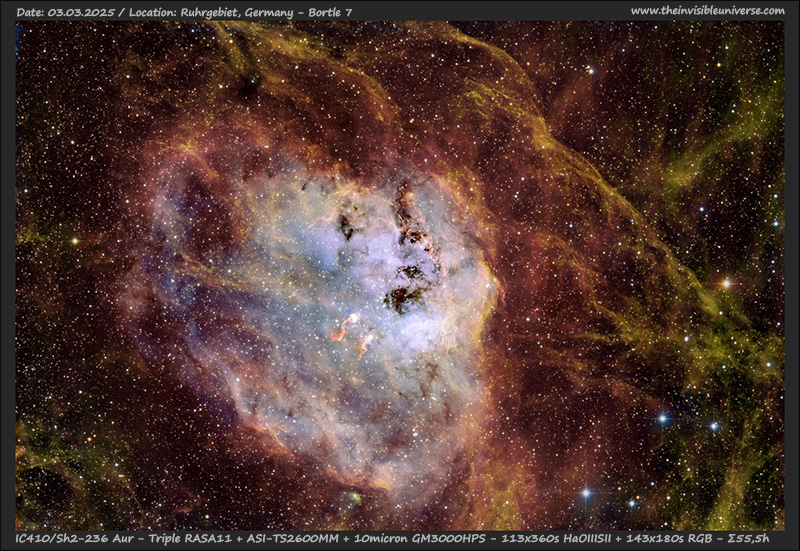 IC410 Tadpole Nebula or Sh2-236 in the constellation Auriga. This region lies very close to the Flaming Star Nebula in the sky, but is much further away. Inside the nebula is the young and hot star cluster NGC1893, which is part of the Auriga OB2 stellar association. The hot and bright O stars of the cluster emit energy that ionises the surrounding gas of IC410. The Tadpoles within the nebula are the dust and gas remnants of NGC1893. The gas tails are blown away by the radiation pressure of the young hot stars.