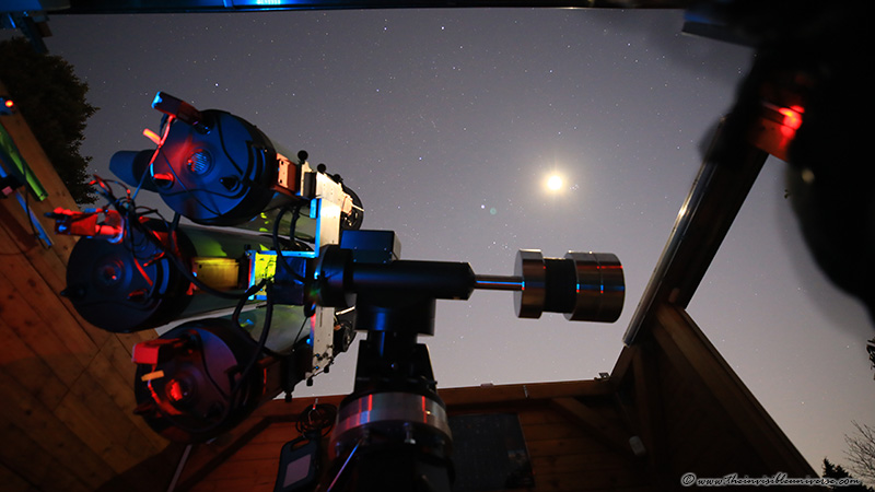In 2023, I upgraded my observatory equipment considerably by buying a huge 10-micron GM3000HPS mount and installing three Celestron RASA11 v1 astrographs with three monochrome ZWO ASI2600MM cameras. All three telescopes look at the same spot in the sky, which allows me to collect three times more light per night than with just one telescope. In addition, the RASA11 is lightning fast with its focal ratio of F2.2. With this triple RASA11 astrograph, I am able to take broadband images under the sky of Bortle 7 with amazing results.