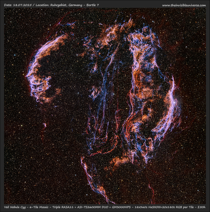 This is my huge 6-tile mosaic of the famous Veil Nebula with a total of 120 megapixels. I spent a total of 50 hours capturing the 6 tiles in Ha, OIII and SII as well as RGB with my triple RASA11 astrograph. Of course, it would have been easier to use a shorter focal length optic and the ASI6200MM full-frame camera with 60 MPix to capture the nebula with less effort. But in this case I have the resolution of an optic with 620 mm focal length and 11 inch aperture. However, this can only be realised if the photo is viewed in full resolution. The image processing of such a large amount of data, 6 tiles with 6 channels each, was a pain. I used Pixinsight with the integrated mosaic procedures to align the individual tiles and stitch them together.