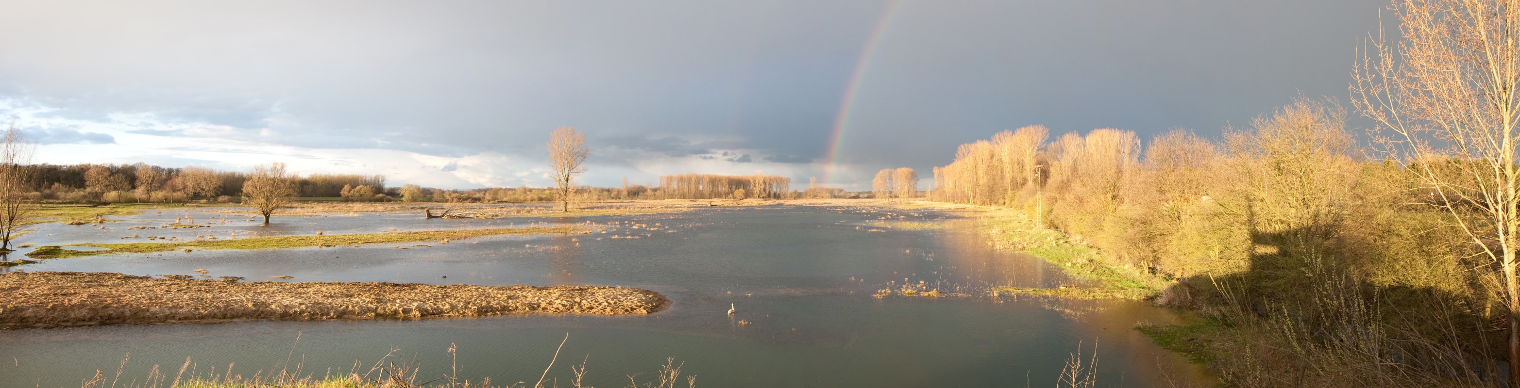 Panorama der Hellinghauser Mersch vom Aussichtshügel am Anglerweg. Ein wunderschönen Regenbogen stand kurz nach einem heftigen Gewitter über dem Horizont. Wer genau hinschaut erkennt sogar einen zweiten schwächeren Regenbogen.