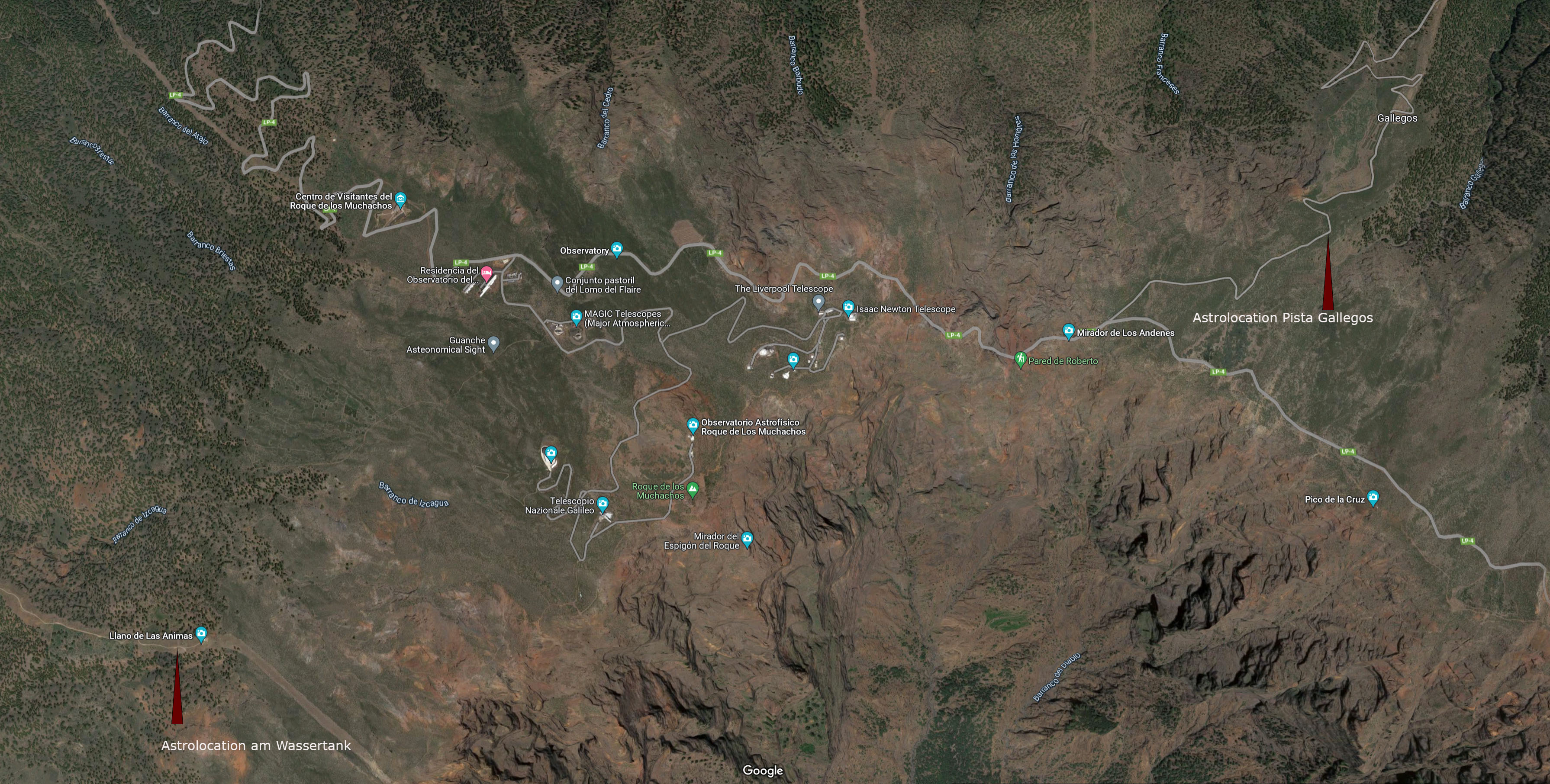 The two Astrolocations near the Roque de los Muchachos on La Palma: one is near the Llanos de las Animas as stated on Google Maps, GPS coordinates 28.748366, -17.908871. It is a steep paved road that starts at the petrol station in Puntagorda. A paraglider launching site is also located on this runway and is signposted.