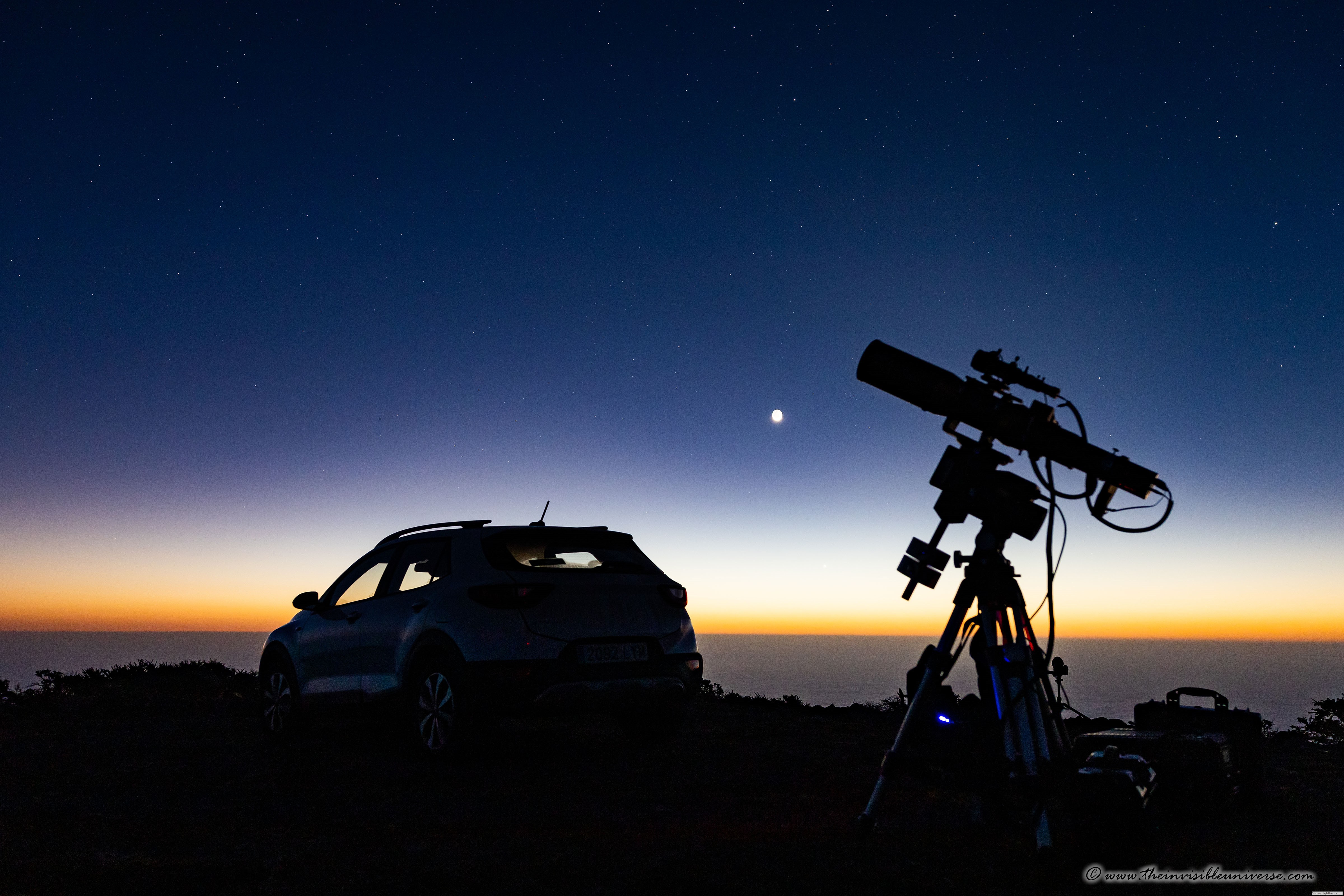 Dawn at Roque de Los Muchachos, La Palma, at 2000m altitude after a long clear night under the canopy of stars. The young crescent moon rises above the sea of clouds of the Atlantic and illuminates my astrophoto setup with the 10micron GM1000HPS and my TMB APO. As a small SUV, the Kia Stonic was very handy in transporting the equipment to this remote location. At an altitude of 2000 m above sea level I found a good observing site at the so called Pista de Gallegos, a small road leading north from LP-4 near Roque de Los Muchachos. The observing conditions that night were quite good, it was windless and temperatures were around 7°C. The Calima weather phenomenon had passed, but observing conditions had not yet fully stabilized. Canon EOS RP + Sigma Art 28mm f1.4.