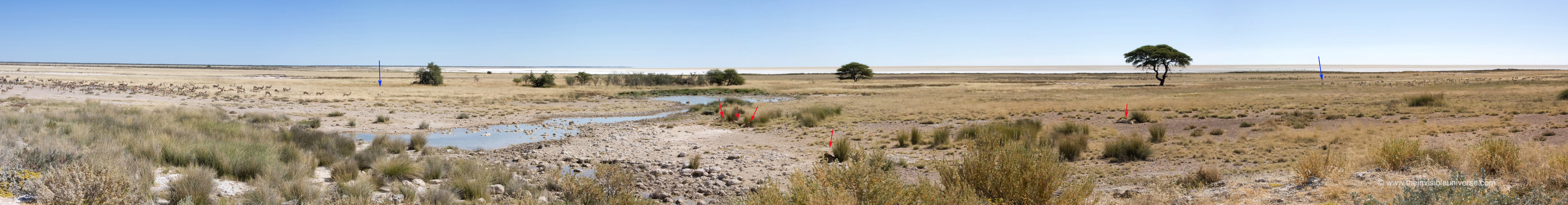 Auch ein Löwenrudel konnte ich während der Nachmittagszeit beoachten. Die Löwen, ca. 9 Einzeltiere an der Zahl, faulenzten an dem "Salvadora"-Wasserloch direkt an der Etosha-Pfanne. Folgendes Panoramabild hat deshalb einen interessanten Hintergrund: das Löwenrudel blockierte das einzige Wasserloch in der Umgebung. Etliche hundert Tiere, darunter Gemsböckte und Zebras, trauten sich deshalb nicht ans Wasserloch...aus verständlichen Gründen. In dem Panoramabild, das ich and em Wasserloch gemacht habe, ist in der Mitte des Bildes das Löwenrudel zu sehen, gut versteckt und deshalb mit roten Pfeilen markiert. Sowohl von rechts, asl auch von links nähern sich vorsichtig mutige Einzeltiere aus zwei grossen Gruppen von Tieren dem Wasserloch (blaue Pfeile). Alle anderen Tiere warten vorsichtig ab. In den folgenden Minuten trauten sich tatsächlich einige Tiere, vor allem wohl sehr durstige Gemsböcke, ans Waserloch. Sobald die Löwen allerdings aufmerksam wurden flüchteten die Tiere wieder.