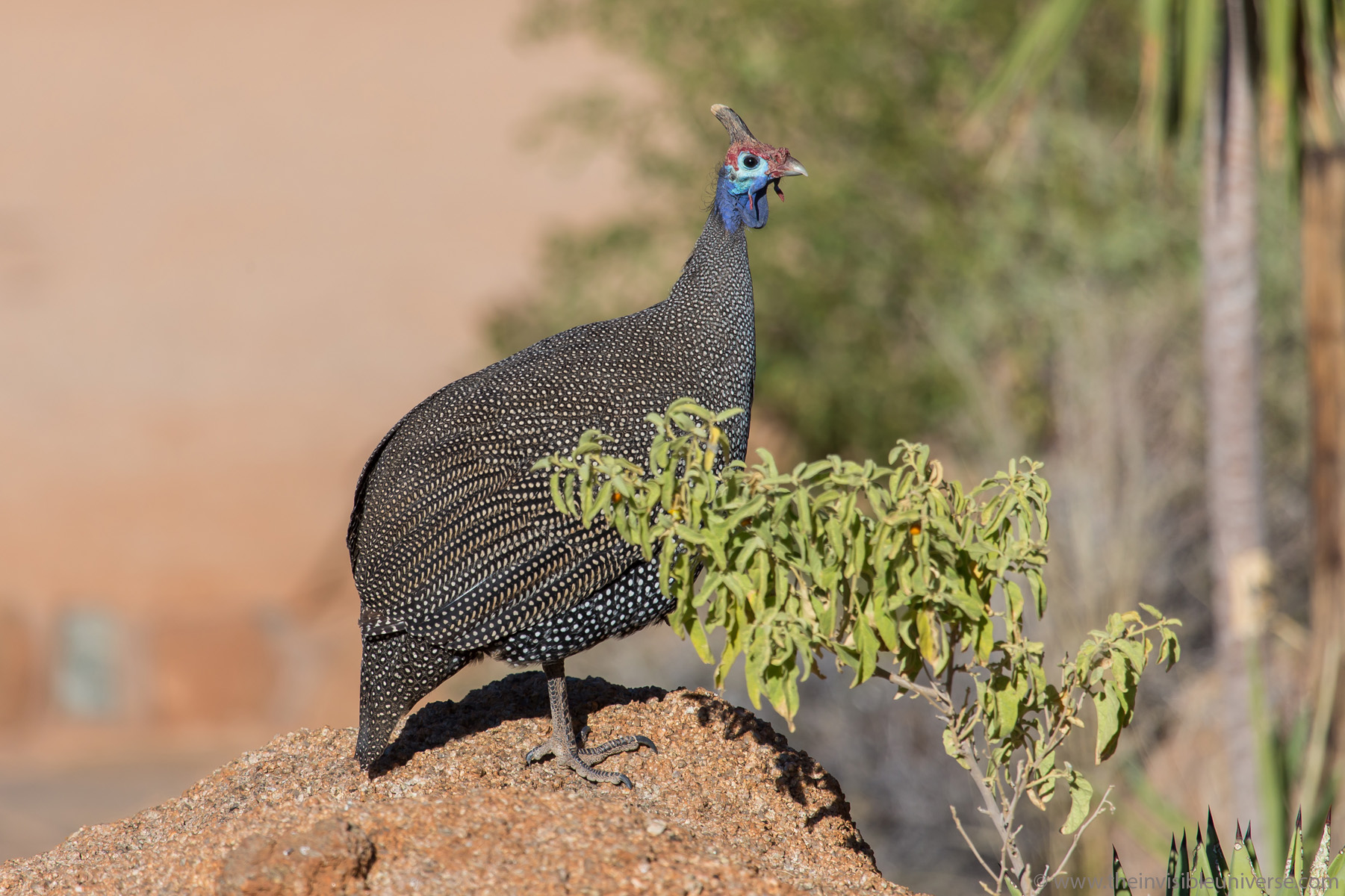 Ein paar Kilometer von dem Spreetshoogte Pass entfernt liegt das Barchan Dune Retreat. Umgeben von Bergen ist dieses kleine aber schöne private Anlage zwar nicht unbedingt direkt an eine Düne gebaut, wie der Name vermuten lassen könnt, aber mit einem herrlichen Ausblick auf die umgebende Landschaft. Von jedem der Bungalows, die fast wie Hobbithöhlen in den Hügel gebaut sind, hat man diesen schönen Ausblick auf die Talsenke. Über eine Millionen Ziegel hat der Besitzer eigenhändig gefertigt und zu dieser Anlage verbaut, und hat trotzdem den Reiz dieser Landschaft erhalten. Eine beachtliche Leistung. Interessanterweise hatte ein einzelnes Perlhuhn, sonst recht scheu, den Hof und den Garten als neues Revier auserkoren und streifte nun Tags über dort umher, unbeeindruckt von den Gästen und das Personal - und den zwei großen Hunden.
