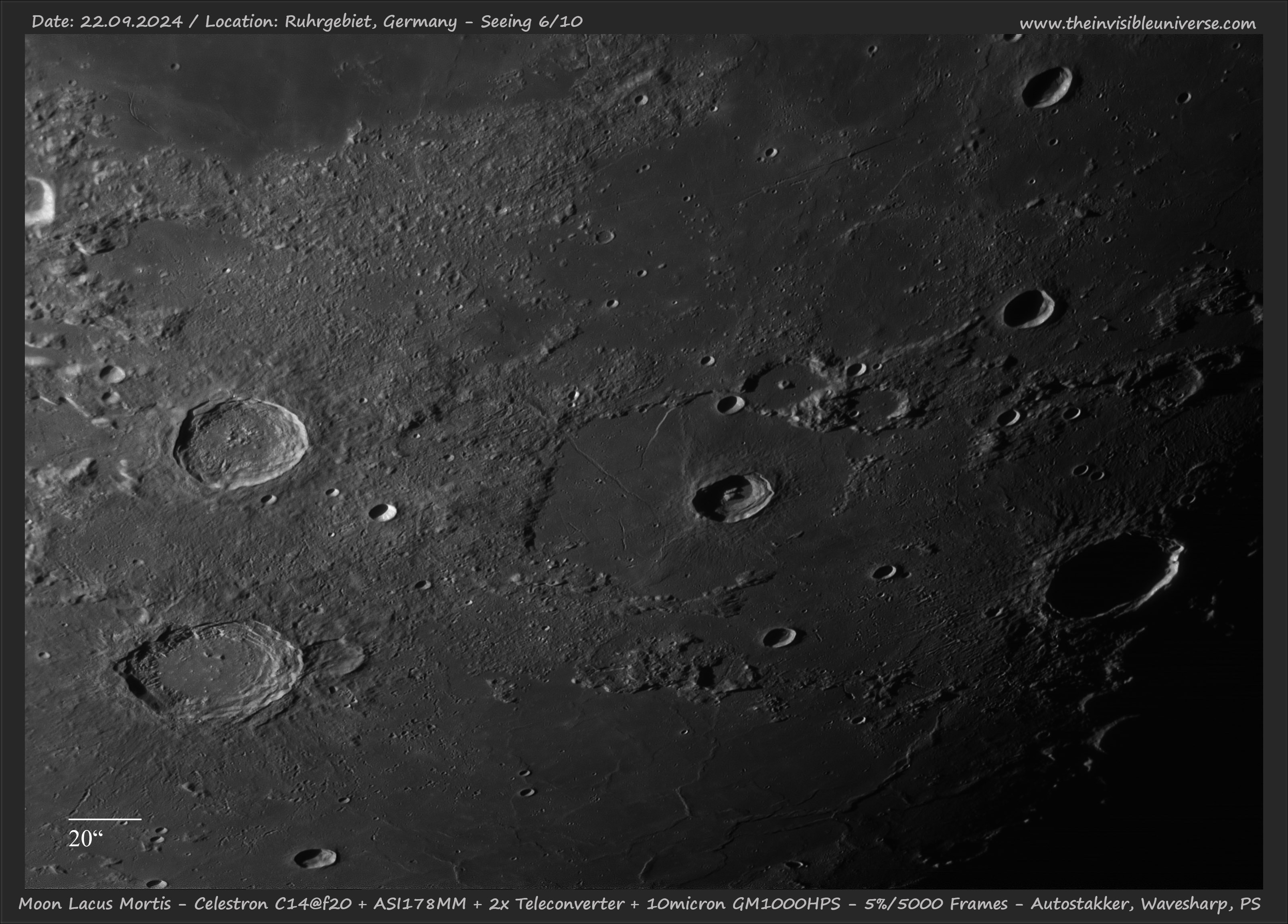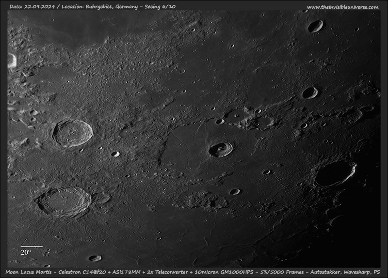 Lacus Mortis and crater Aristoteles and Eudoxus on September 22, 2024, at fairly good seeing.
