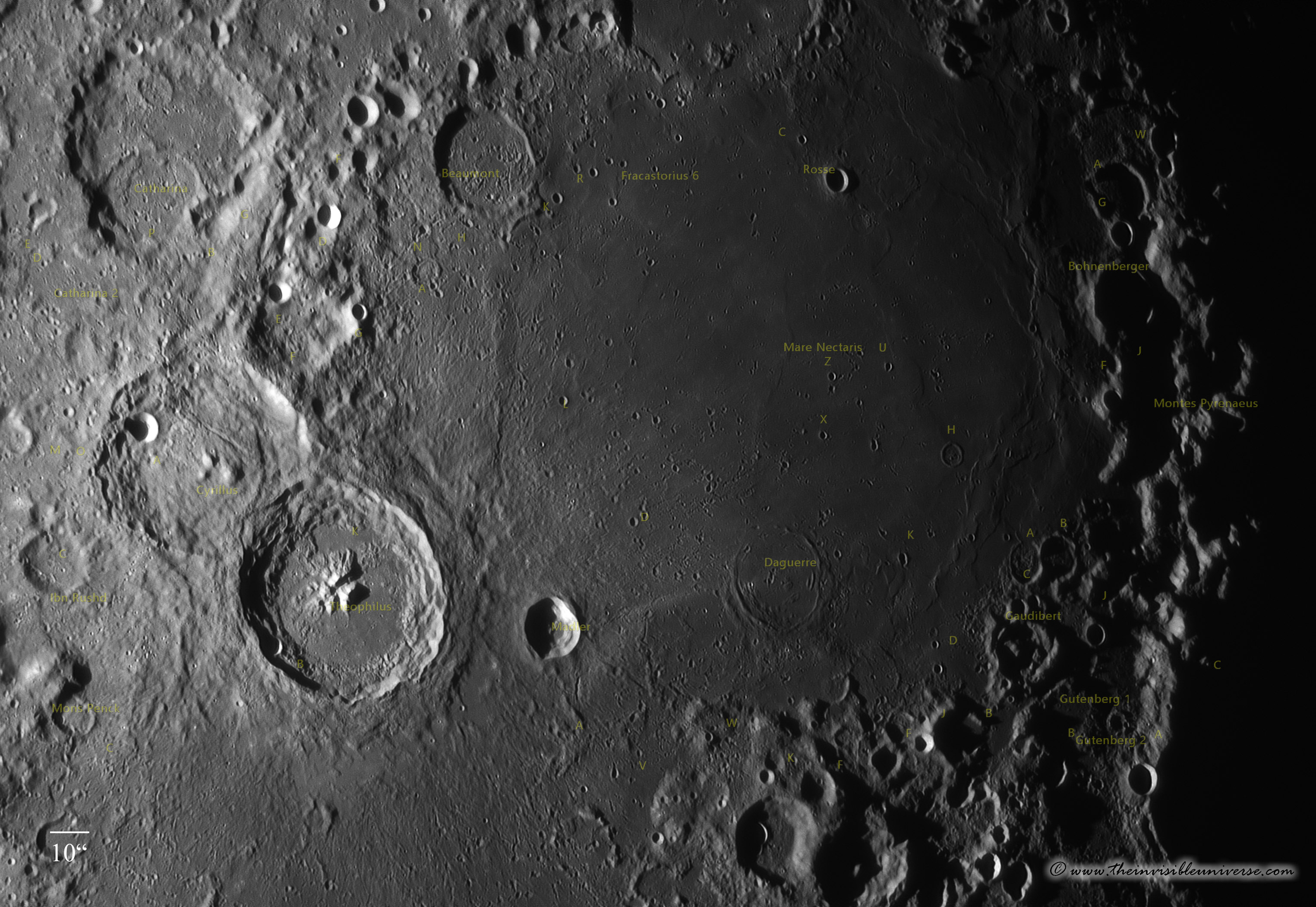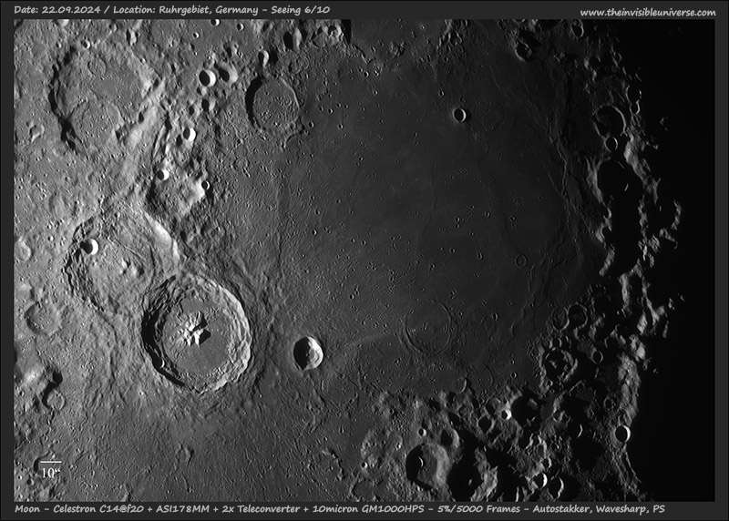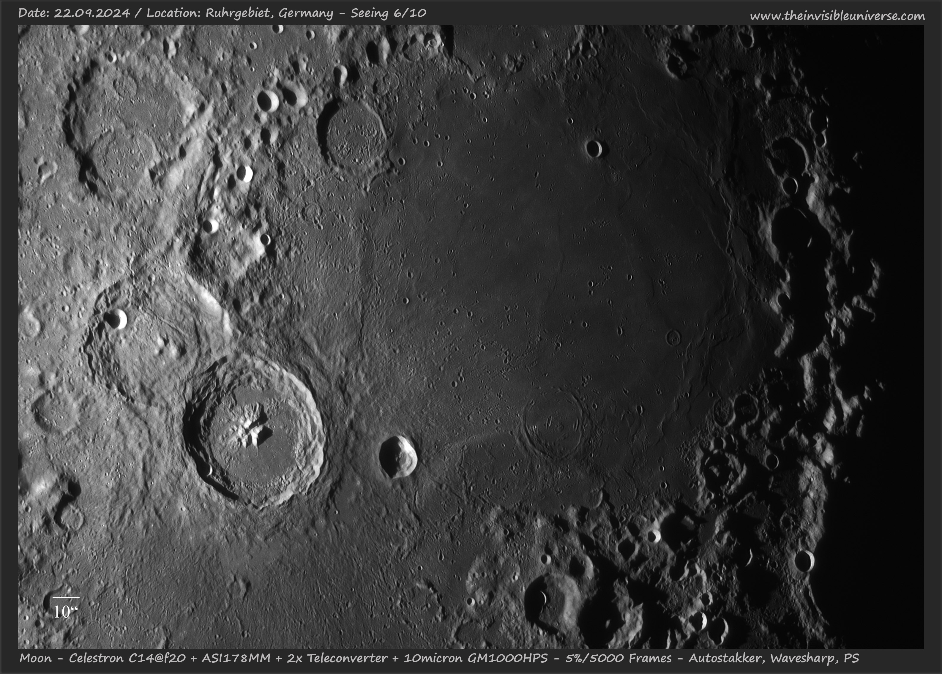 Since Autum 2022, I own a Celestron C14 XLT, an older 14-inch Schmidt-Cassegrain of ok quality that I happened to acquire at a bargain price. My 10micron GM1000HPS can hardly carry the 20+kg weight of this monster scope, but for planetary imaging and visual work it is ok. Annotation of the craters has been done with the aid of the program Virtual Moon Atlas.