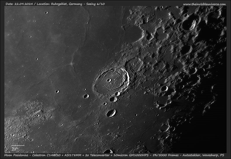 Crater Posidonius at Mare Serenitatis on the Moon on September 22, 2024, at fairly good seeing.