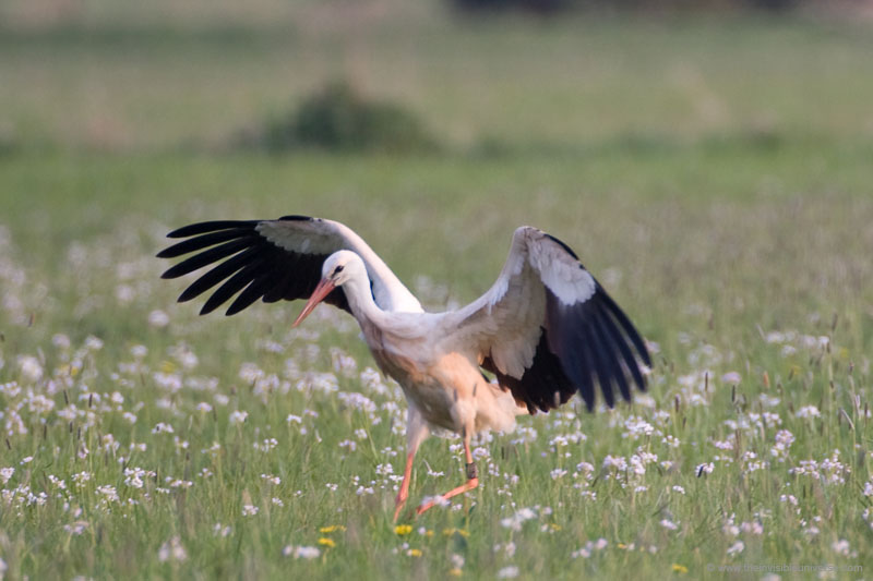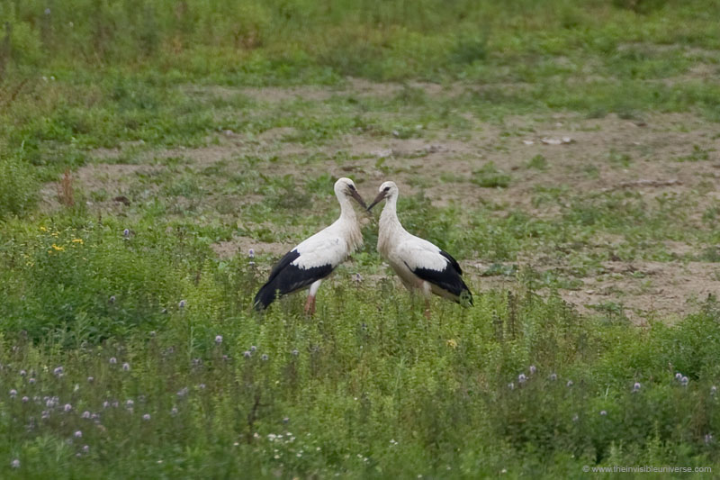 Im Hochsommer sind die Jugstörche fast flügge und machen die ersten Flugübungen. Schon Ende Juli kann ich die Jungen an einem der spärlichen Teiche beobachten. Abends kehren sie aber noch auf den Horst zurück.