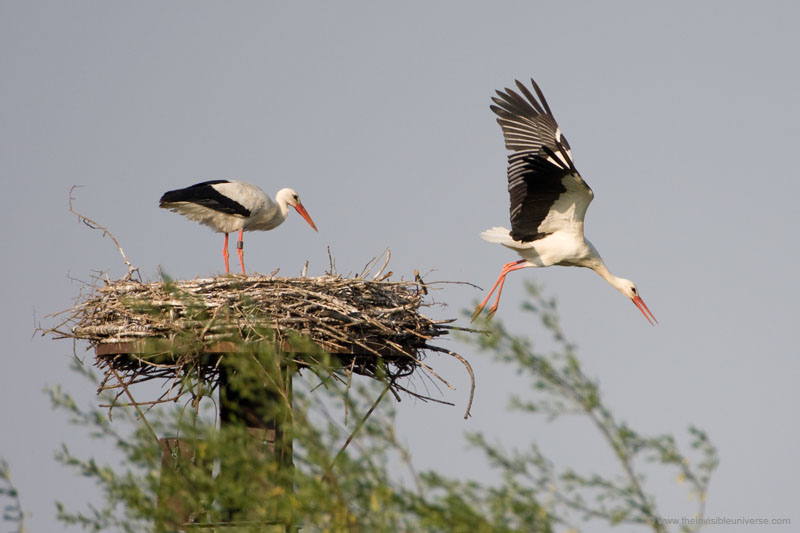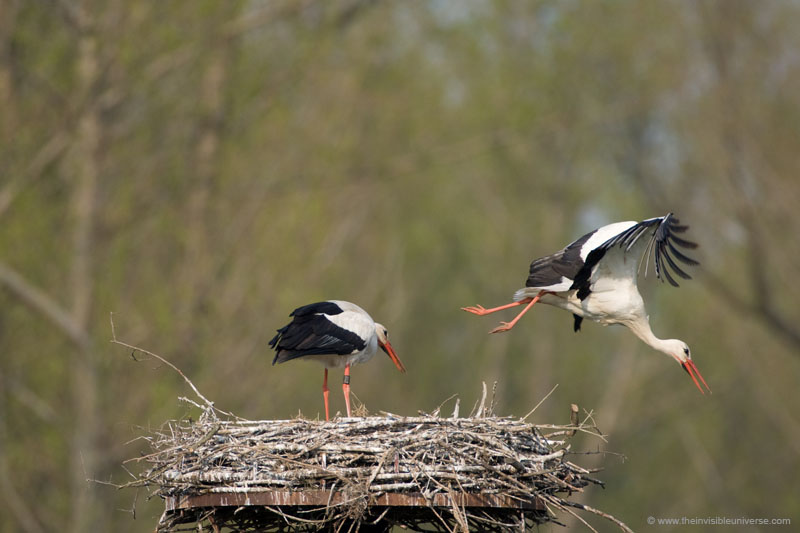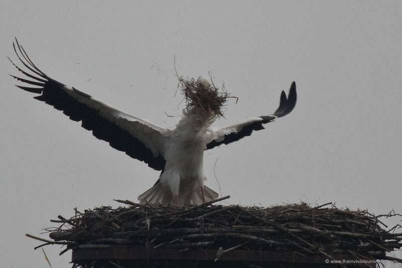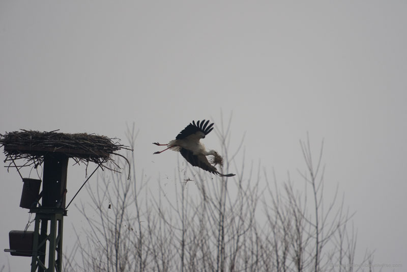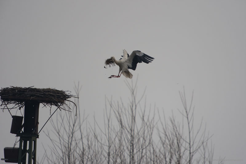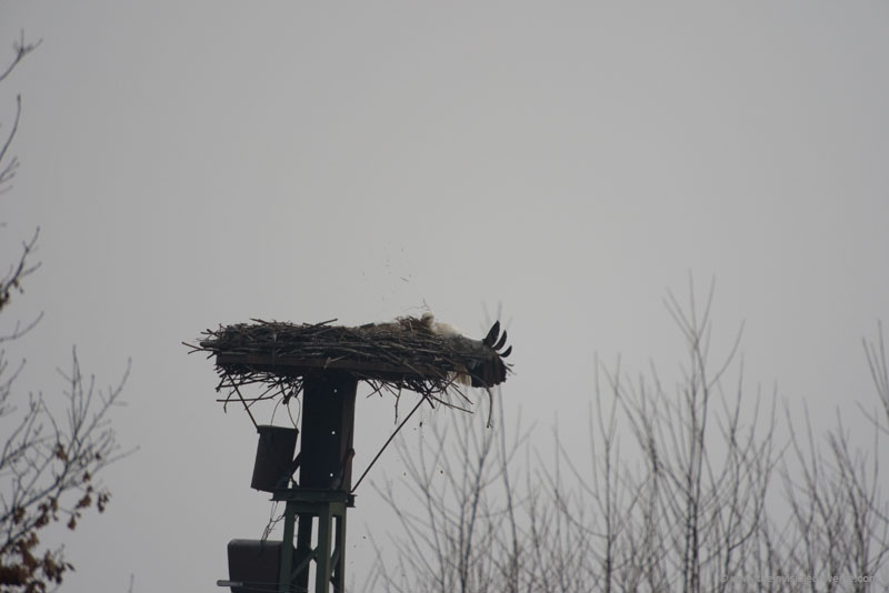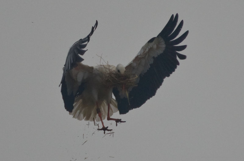 Hier sieht man den erschöpften Storch im Februar bei den ersten Nestausbesserungen. Im Landeanflug verpasst er den Horst um muss eine weitere Runde fliegen um dann heile zu landen.