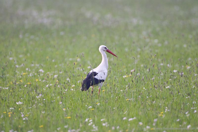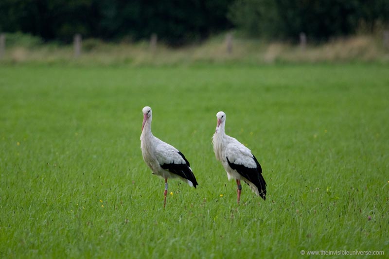 Ein Altstorchpaar bzw. ein Jungstorch auf den blühenden Wiesen der Lippeaue.