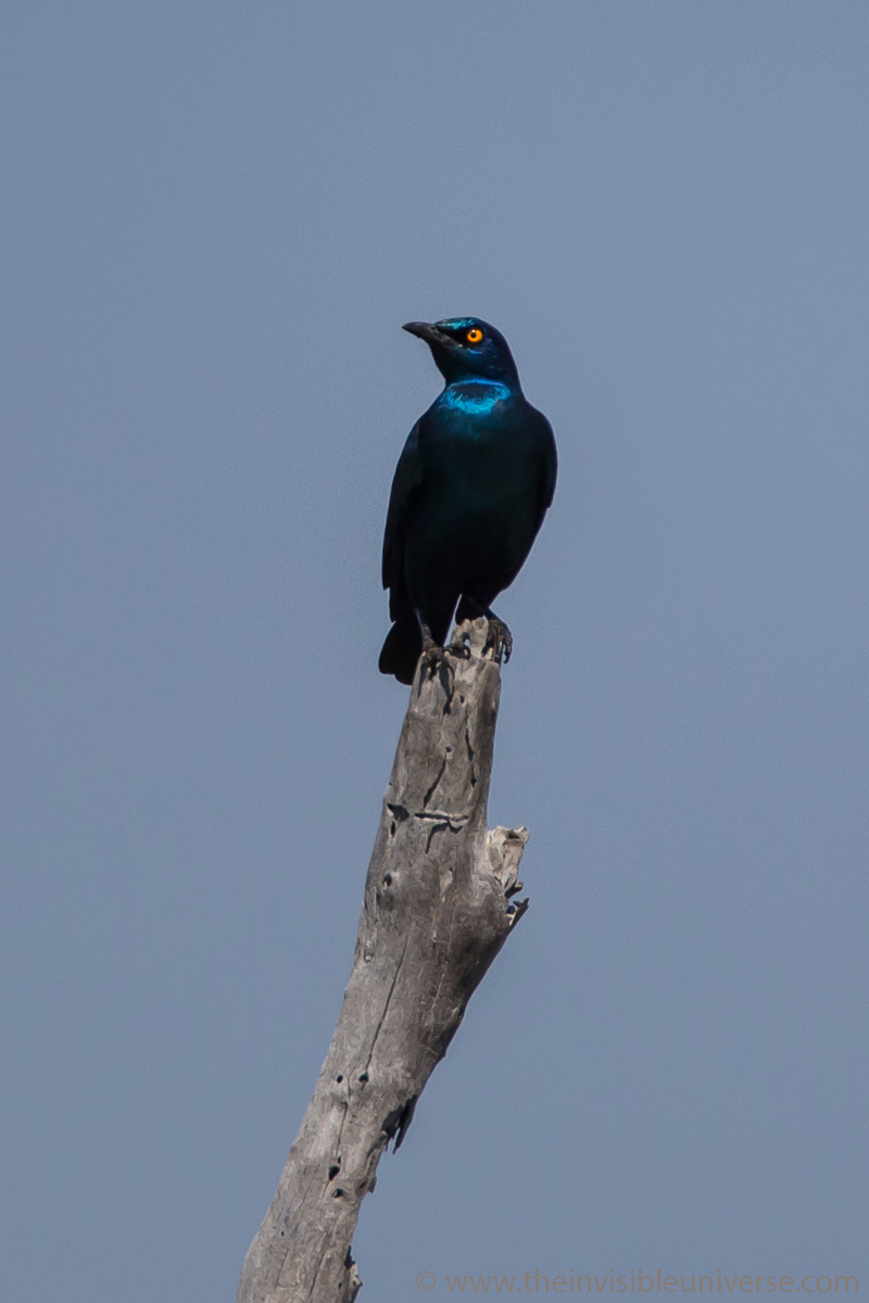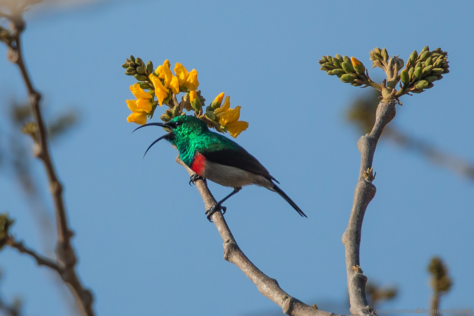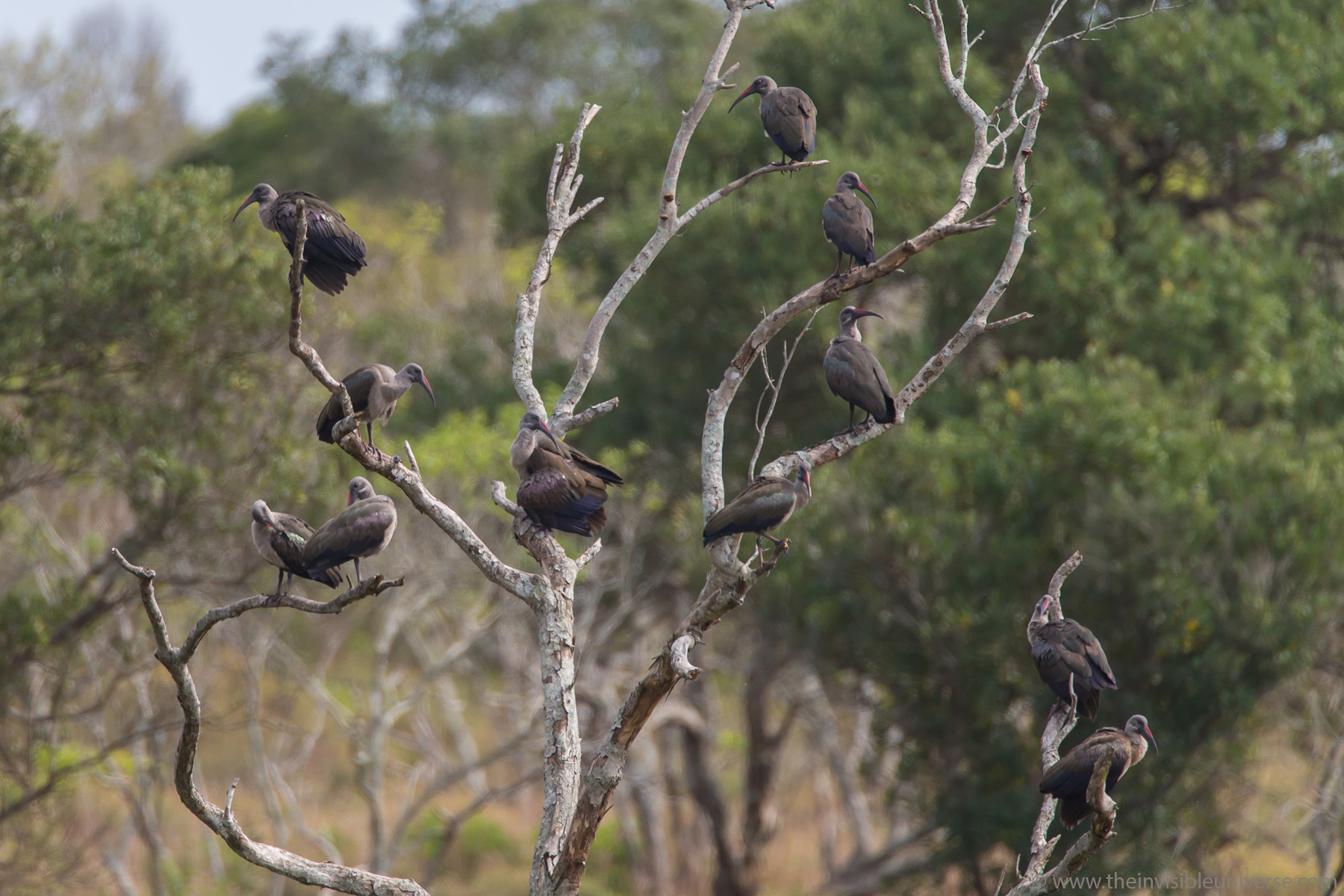 Eine seltene Erscheinung ist der Glattnackenibis. Der Hagedash dagegen gehört auch zu der Familie der Ibise, kommt aber sehr häufig im südlichen Afrika vor und besetzt mit viel Lärm Abends die bevorzugten Schlafbäume. Ein buntes Spektakel bieten die viele Nektarvögel, Glanzstare, Zwerspinte und viele weitere bunte Arten, die man leicht beobachten kann.