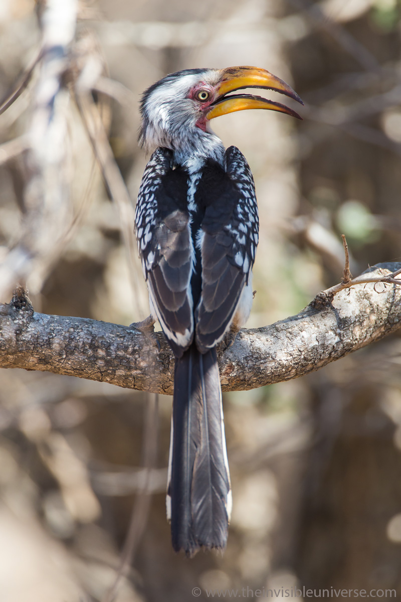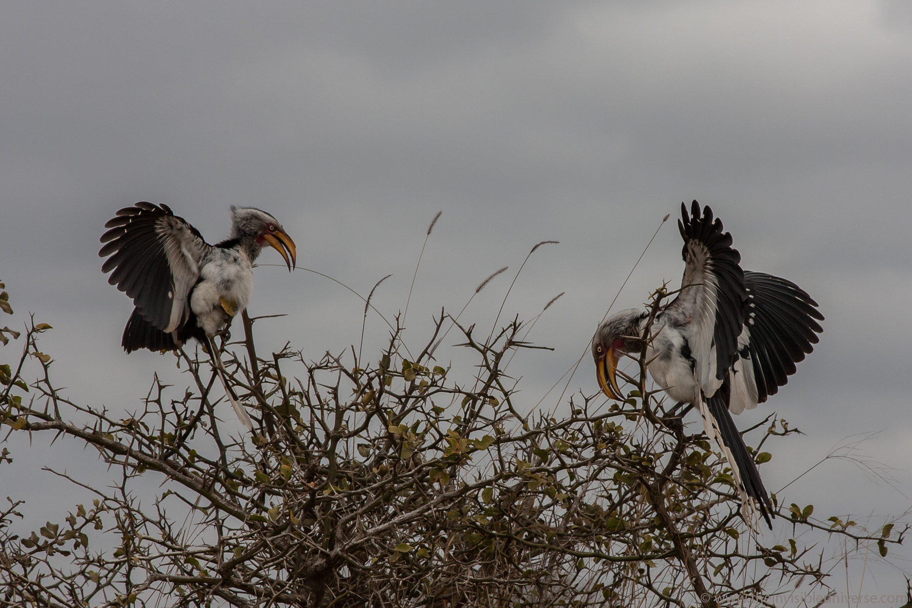 Die aktiven und quirligen Tokos sind fast überall im Krügerpark anzutreffen und sitzen oft an den Strassen und Wegen auf Sträuchern oder suchen die Strasse nach verwertbarem Futter ab. Zwei Gelbschnabeltokos konnte ich bei der Balz beobachten.