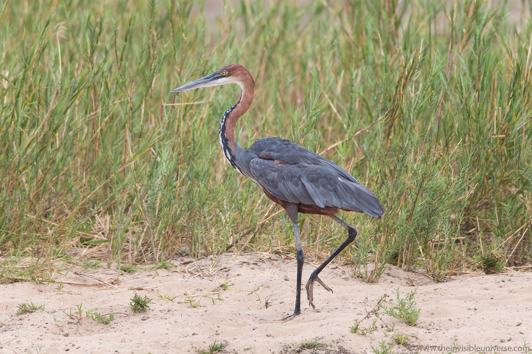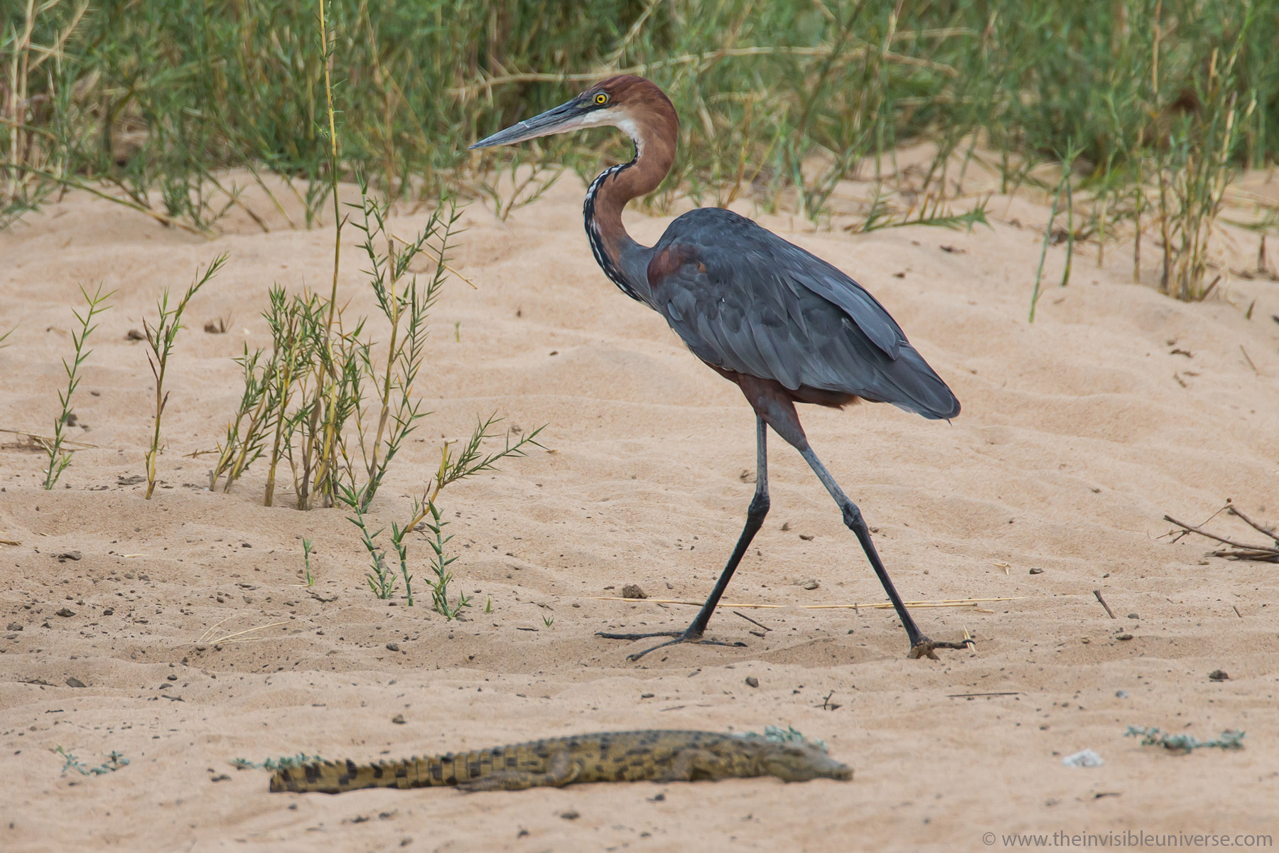 Neben den auch in Deutschland bekannten und mittlerweile wieder weit verbreiteten Graureihern hat der Krügerpark eine Sehenswürdigkeit zu bieten: den Goliathreiher. Der Name ist keinesfalls übertrieben. Dieser Reiher ist wahrlich riesig! das mag auf den Fotos nicht rüberkommen, aber wenn man ihn direkt vor dem Vogelversteck in einem seichten Fluss umherschreiten sieht, kann man nur beeindruckt sein!