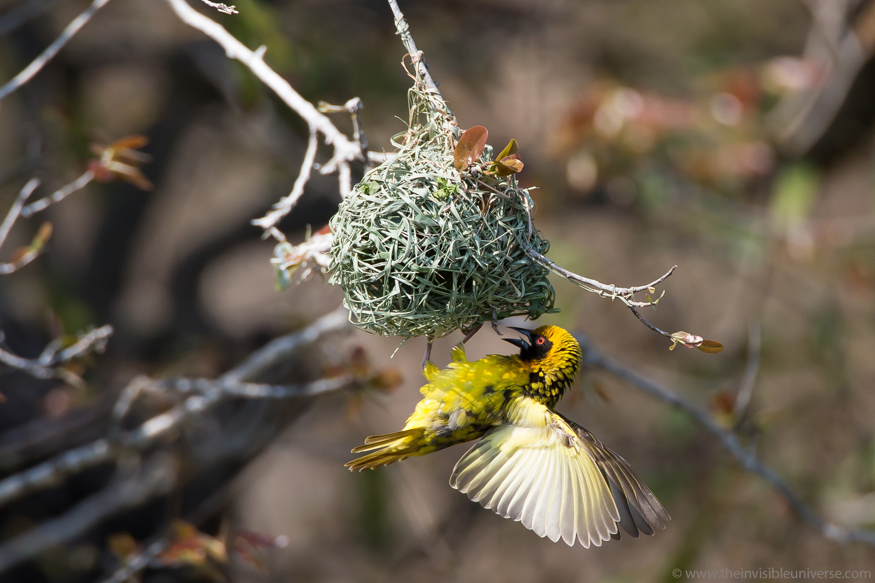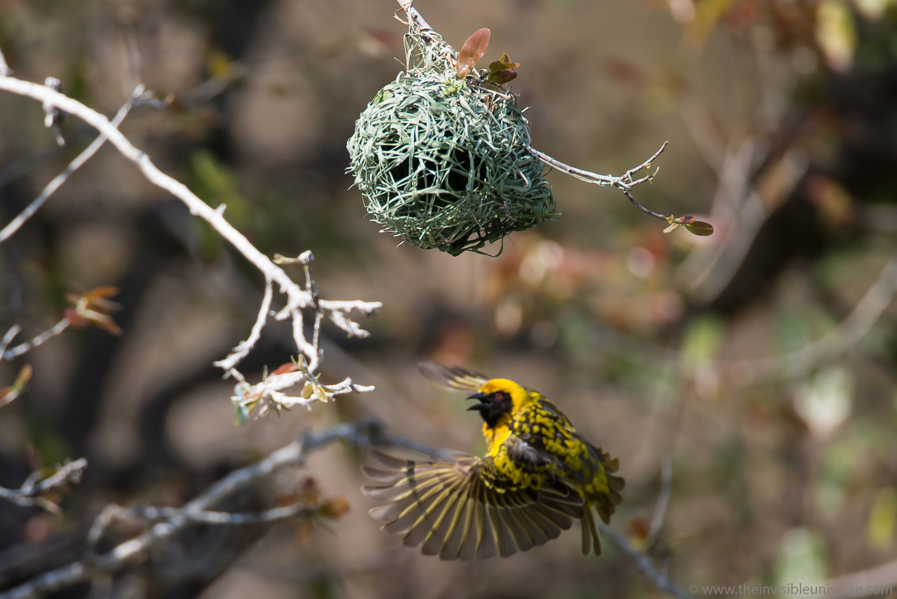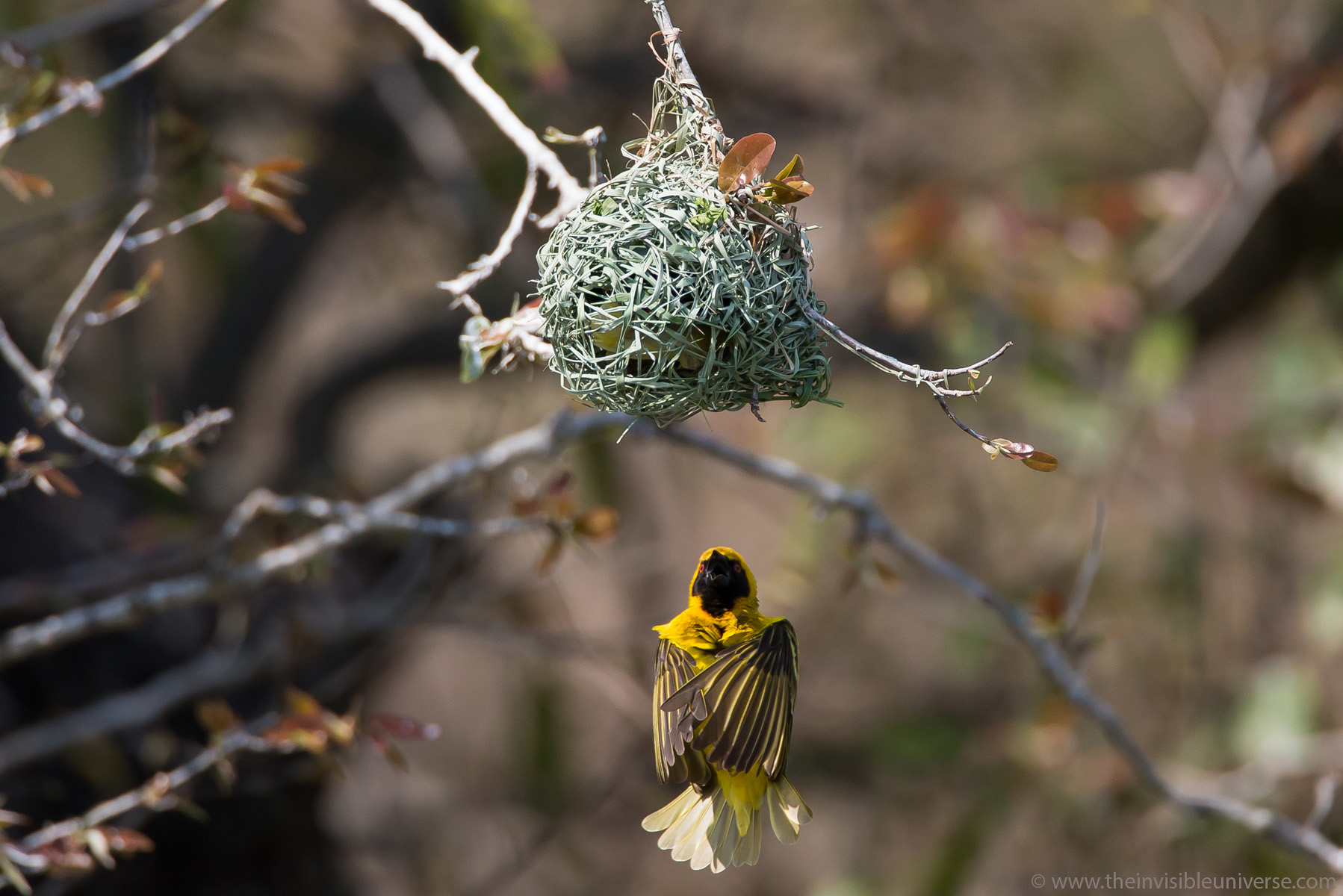 Häufig in verschiedenen Arten und mit recht unterschiedlichen Nestbauten in Afrika anzutreffen. Die hier gezeigte Art der Cabanisweber baut individuelle runde Einzelnester, die wie Weihnachtskugeln von Ästen herabhängen. Am Lake Panik konnte ich diese Vögel sowohl beim Nestbau, wie auch bei der Balz beobachten und auch filmen.