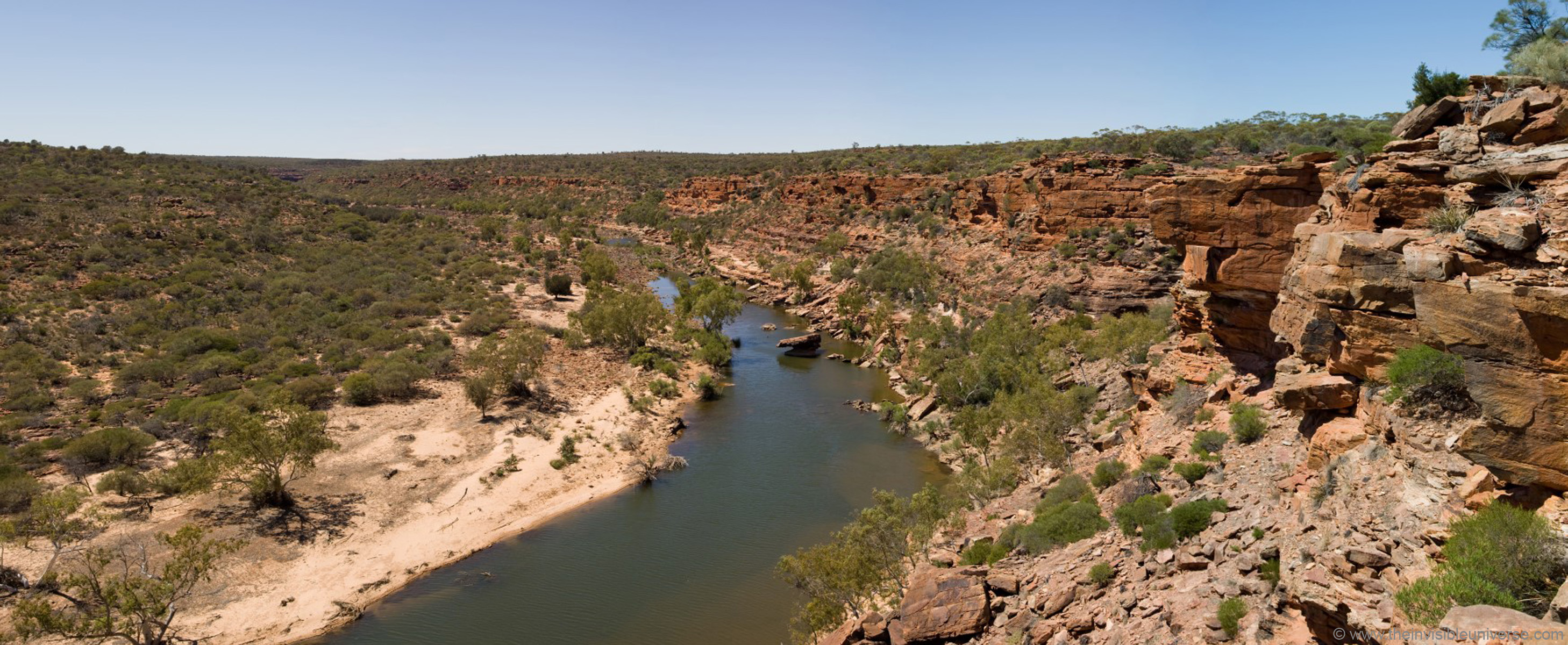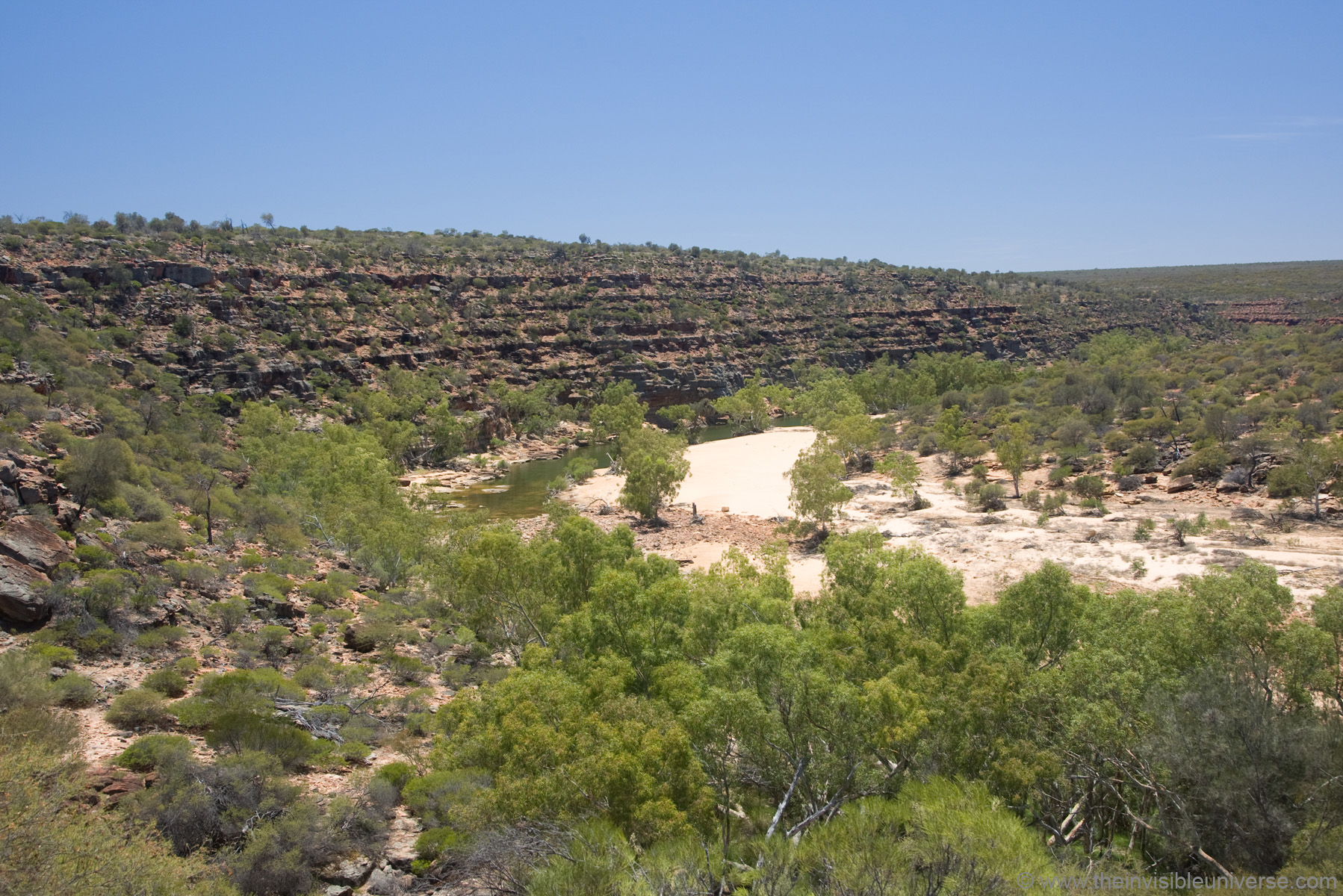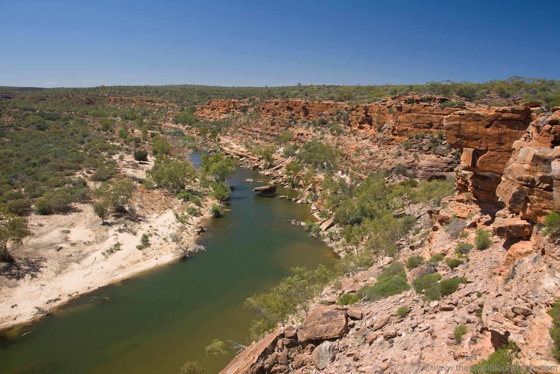 In einem anderen Parkabschnitt hat der Murchison River über Jahrmillionen eine tiefe Schlucht in das rote Gestein gegraben. Über einen Fußweg gelangt man hinunter zum Fluss, bei 35 °C sehr kräftezehrend. Die Aussicht ist aber spektakulär!