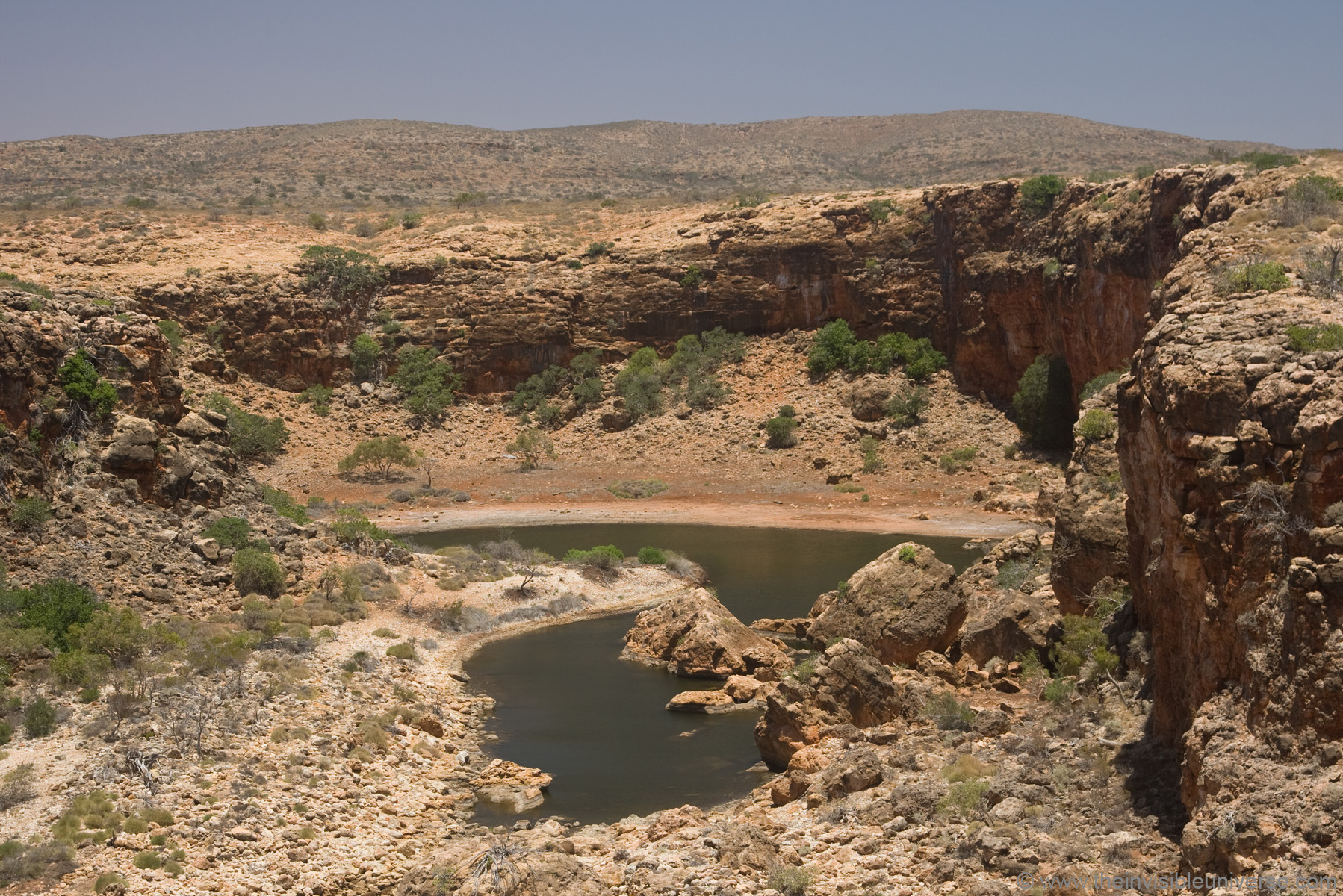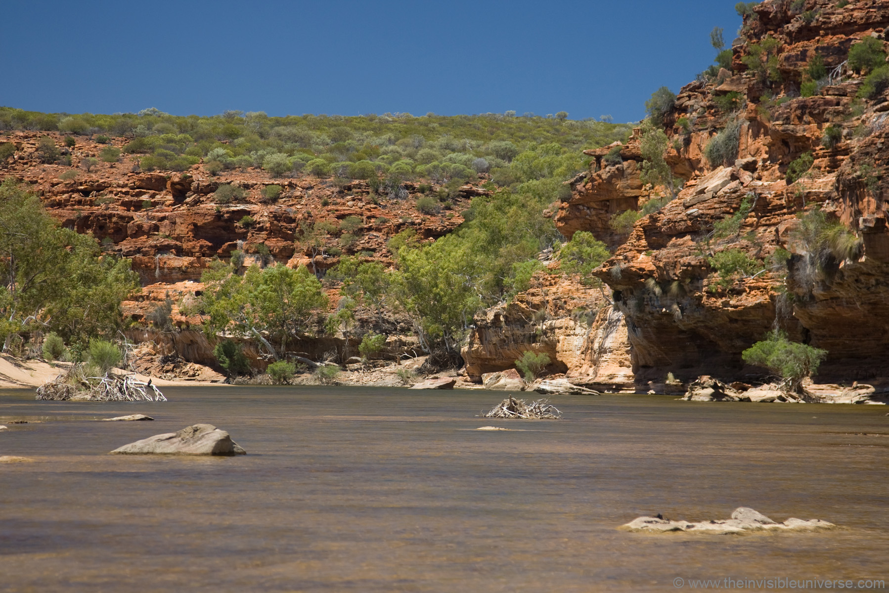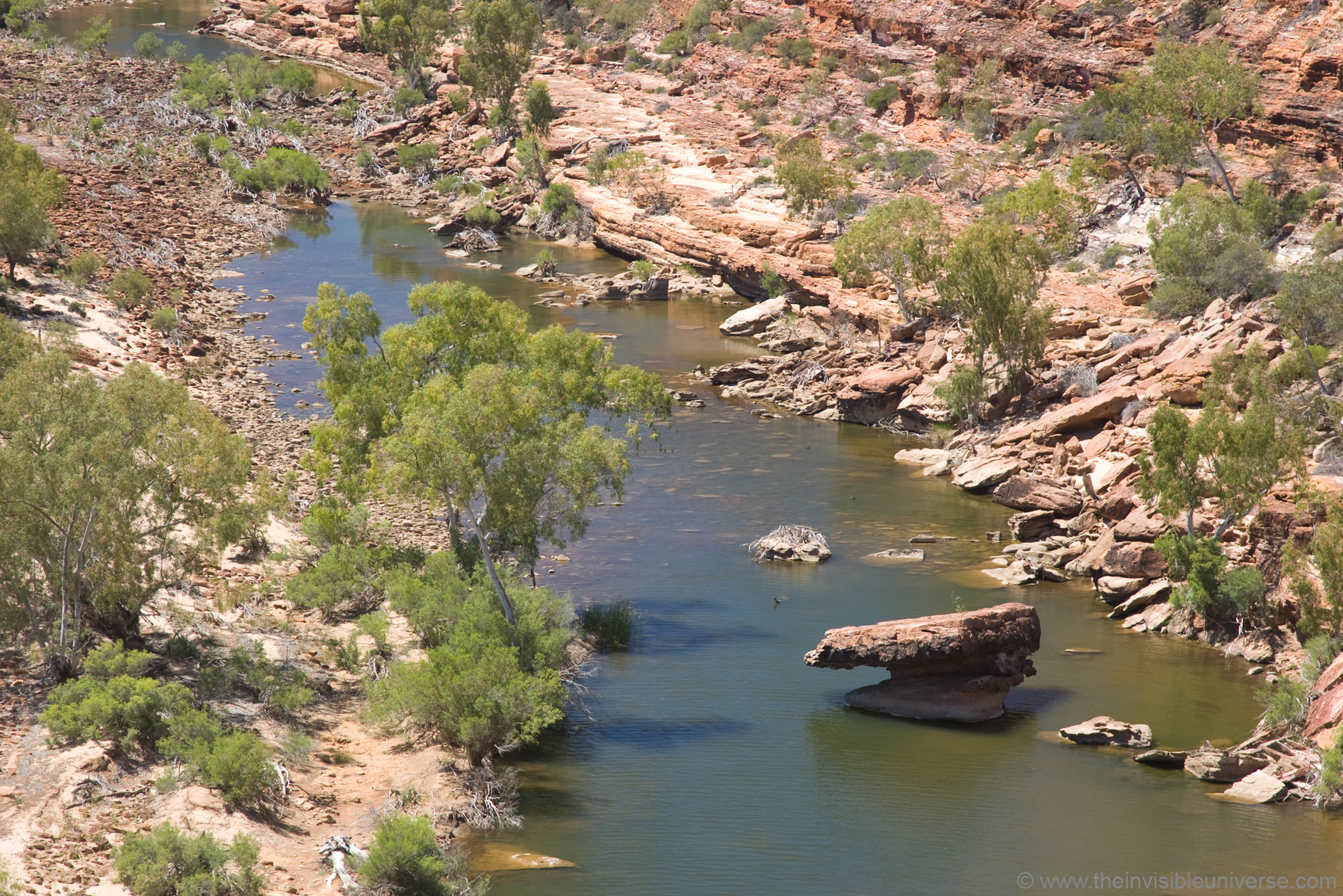 In einem anderen Parkabschnitt hat der Murchison River über Jahrmillionen eine tiefe Schlucht in das rote Gestein gegraben. Über einen Fußweg gelangt man hinunter zum Fluss, bei 35 °C sehr kräftezehrend. Die Aussicht ist aber spektakulär!