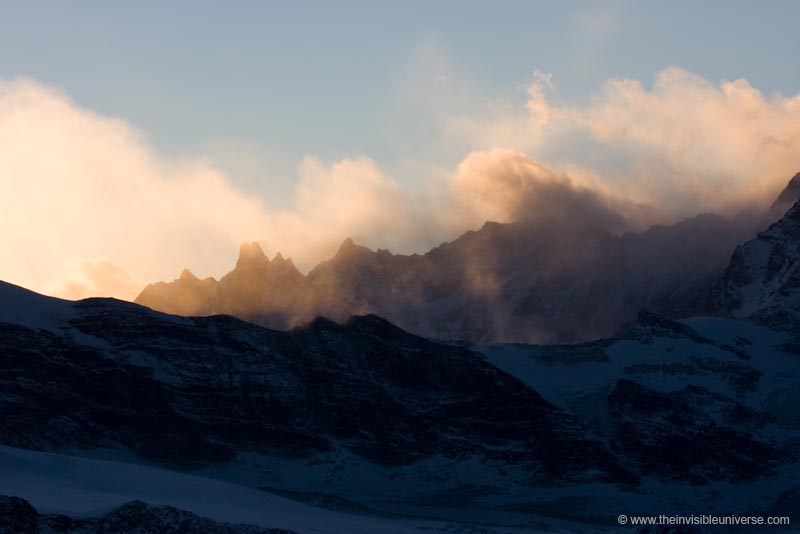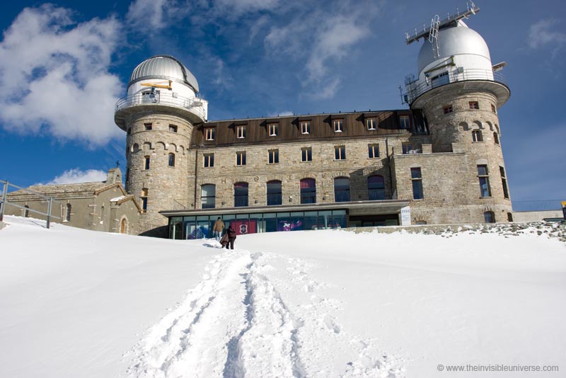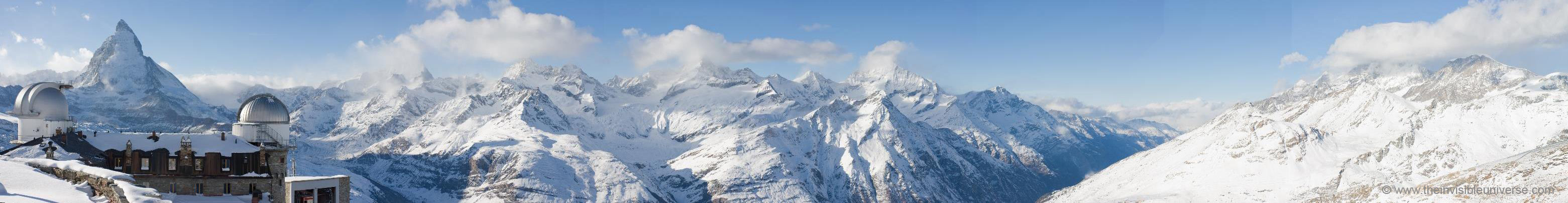 The small village of Zermatt at the base of the famous Matterhorn in Switzerland is a nice place to stay for a winter holiday. If you take the Zahnradbahn to the Gornergrat you can watch many 4000+ meter high mountains and glaciers from that perfect observation place right above the Kulm Hotel Gornergrat with a perfect sight of the Matterhorn - provided no clouds cover it. For Amateur-Astronomers this place is a very good choice for doing Astrophotography of the winter night sky as the sky is quite dark and the air very clear due to the altitude of >3000 m. Perhaps one of the best places for Astronomy in this latitude range in wester Europe. Please note the 360° panorama shot from the observation place above the Kulm Hotel, done with a self made panorama adapter and stitched in Autopano Pro, which is - from my personal point of view - the best panorama software up to date whith far more better results than with Photoshop, hugin or comparable program.