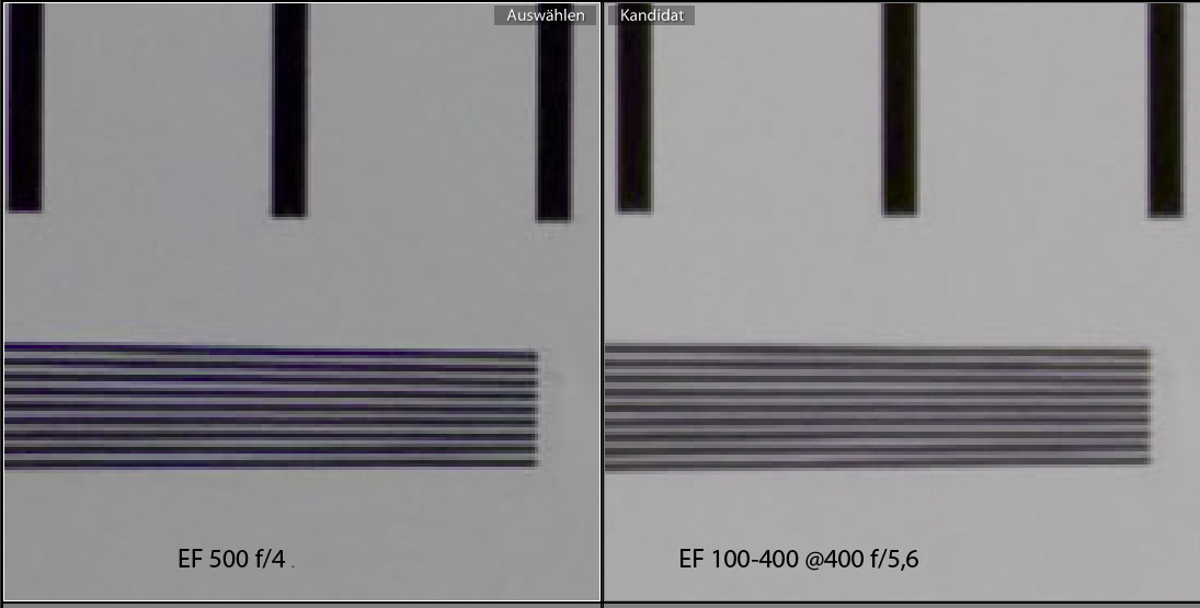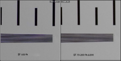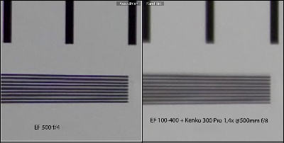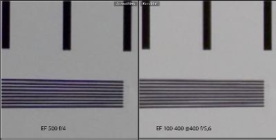 Here I have compared the relatively compact EF 100-400 zomm at 400 mm focal length with the heavy Ef 500 f4 IS professional telephoto lens. I have adjusted the distance for the EF 500 to have the same field of view onto the test chart. At 400 mm the EF 100-400 is pretty good, but the sharpness of the EF 500 is better than everything else I have seen up to now.