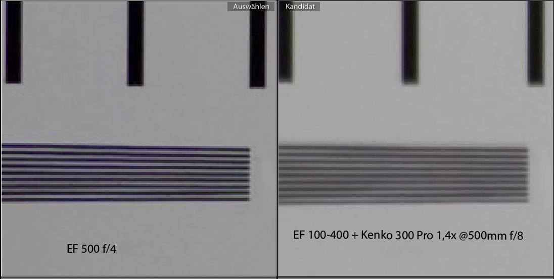 Somehow I don't understand why the EF 100-400 with the Kenko 1,4x reducer has a pretty large backfocus and without the converter a pretty small one, but the EF 500 with/without reducer shows barely no difference. The bad sharpness of the EF 100-400 with teleconverter makes it more difficult to find the right AF adjustment setting, so it might be that the value could be a bit smaller than +8 without loosing sharpness.