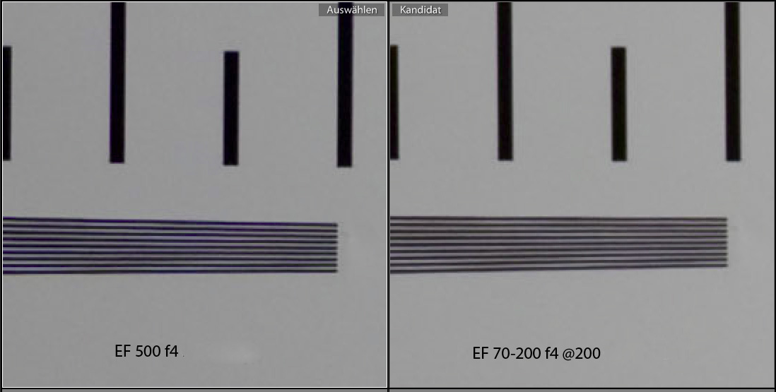 Althought these two lenses differ in focal length significantly a comparison shows, that the EF 70-200 is pretty good at 200 mm compared to the EF 500 reference level lens.