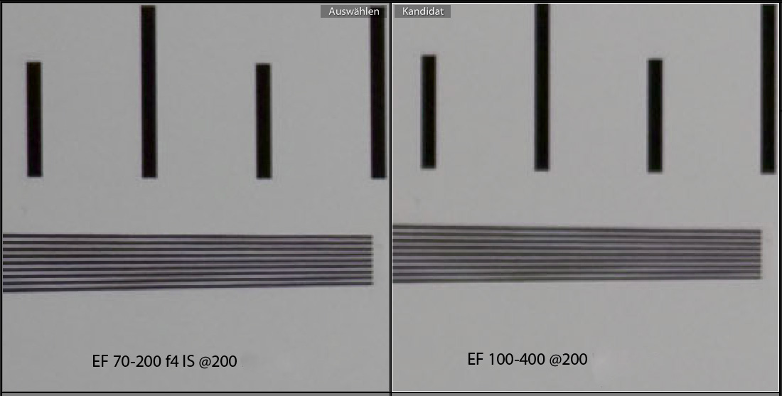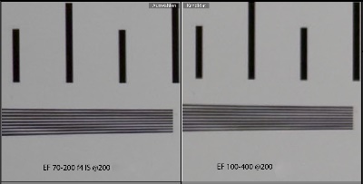 The Sharpness of the EF 70-200 f4 IS is extremely good compared to the EF 100-400, which of couse covers a larger focal range. The difference seen on this test chart photograph may not be that big, but if you shoot structures like distant trees, or feather of a bird the differences in sharpness will be visible, provided that you zoom in digitally or make a large format print out.